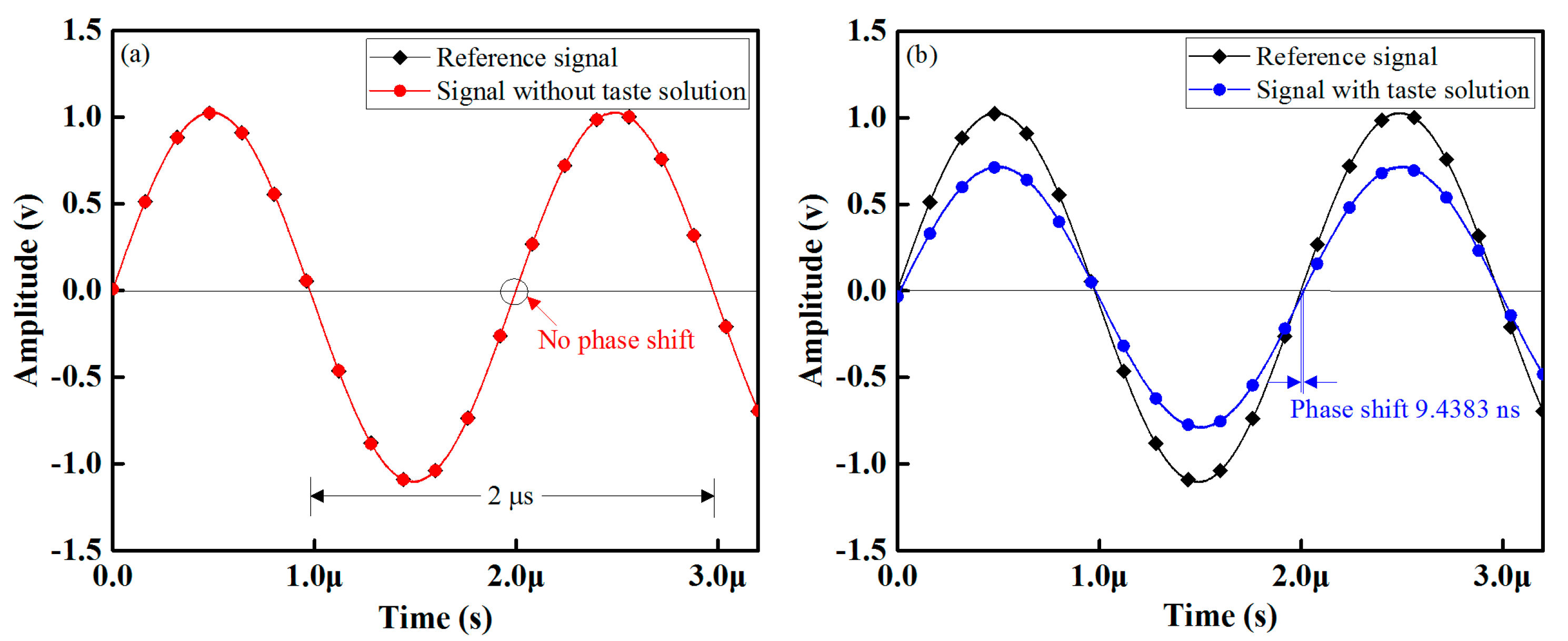 Waveform response of the designed electronic tongue: (a) response with reference solution (DI water) and (b) response with taste (glucose) solution.