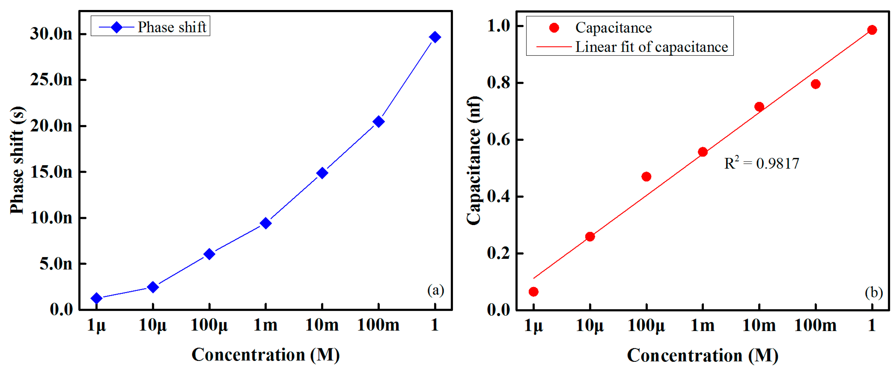 Figure 10a shows the phase shift within the sensing signal and the reference signal at glucose concentrations ranging from 1 μM to 1 M. As is readily apparent from this figure, the phase difference/shift within the two signals increases linearly with the increase in glucose concentration. The variation of capacitance with respect to the concentration of glucose/taste solution is shown in Figure 10b.