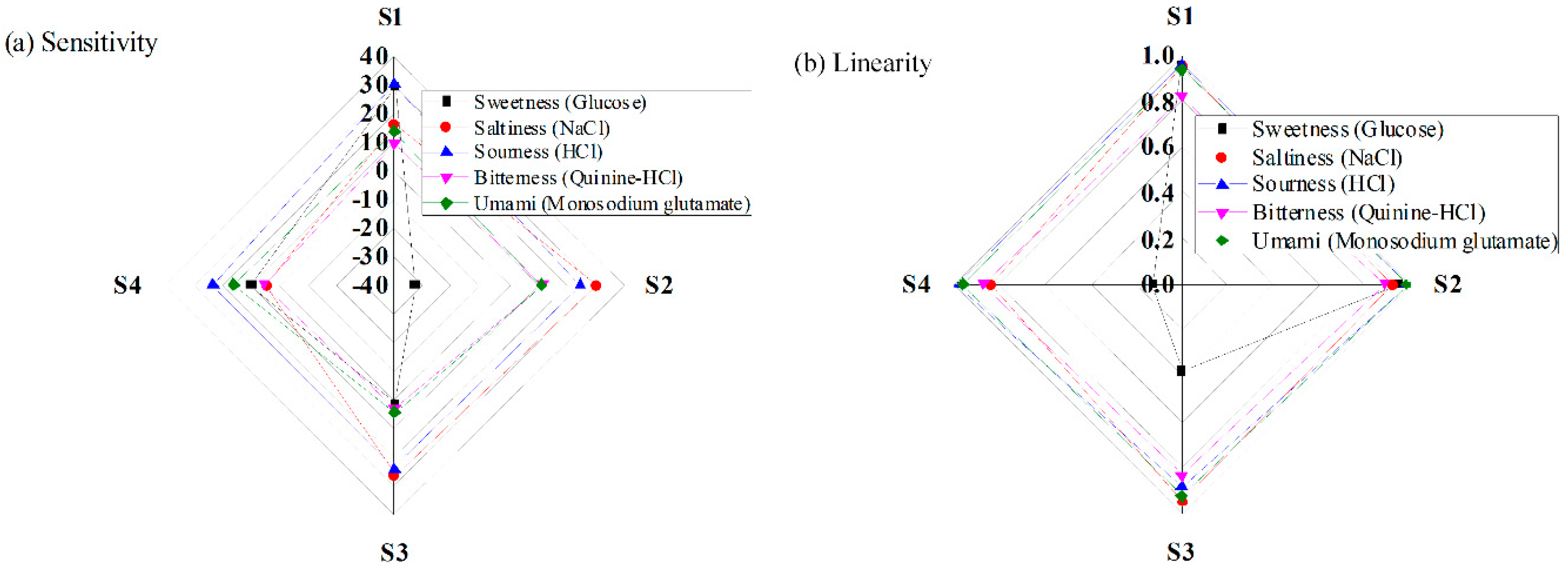 Performance of the designed IDC taste sensor array for various taste solutions: (a) sensitivity; and (b) linearity.