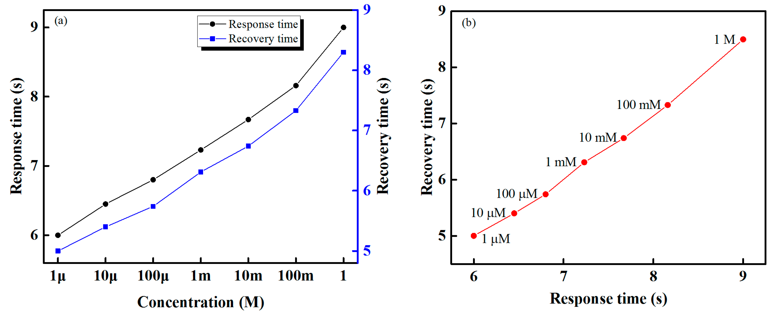 Sensing performance of the designed IDC electronic tongue for different concentrations of HCl: (a) response and recovery times and (b) response times versus recovery times.