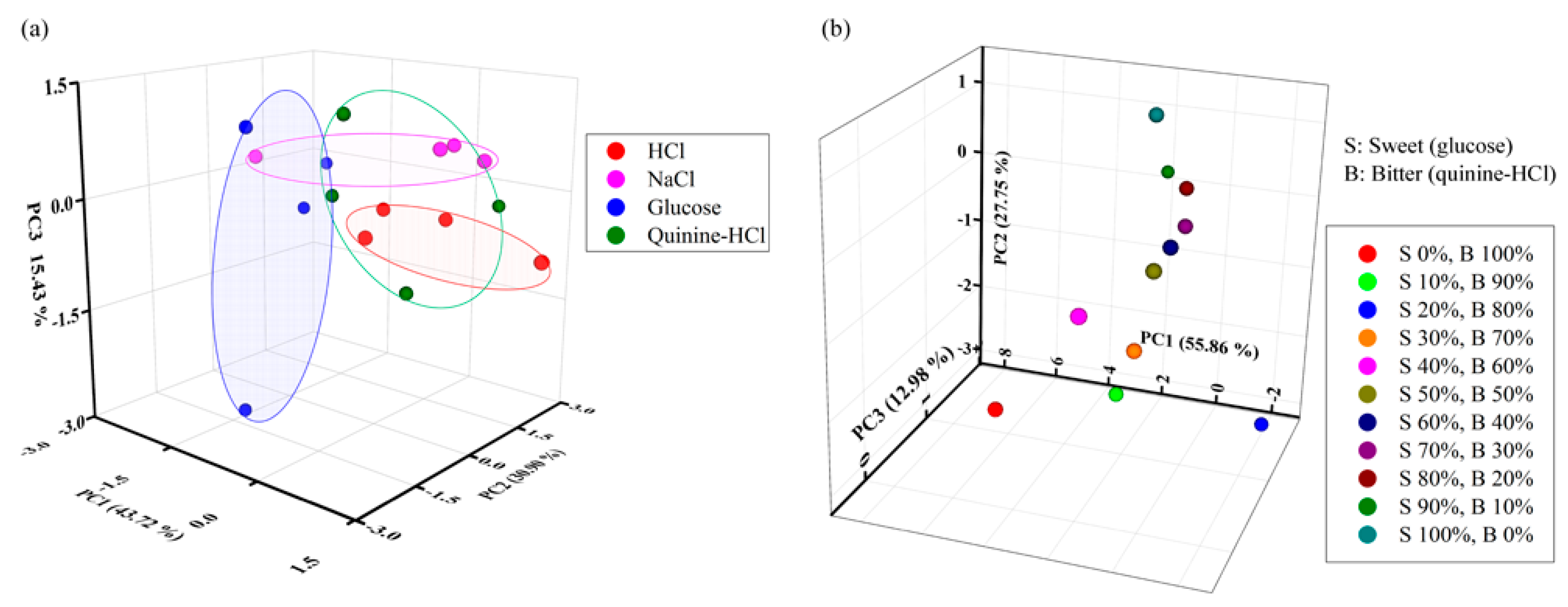 PCA results for the dataset obtained by sensing mixed taste solutions with the designed IDC electronic tongue: (a) mixture of four different taste solutions (HCl, NaCl, glucose, and quinine-HCl) and (b) different percentages of mixed glucose and quinine-HCl solutions.