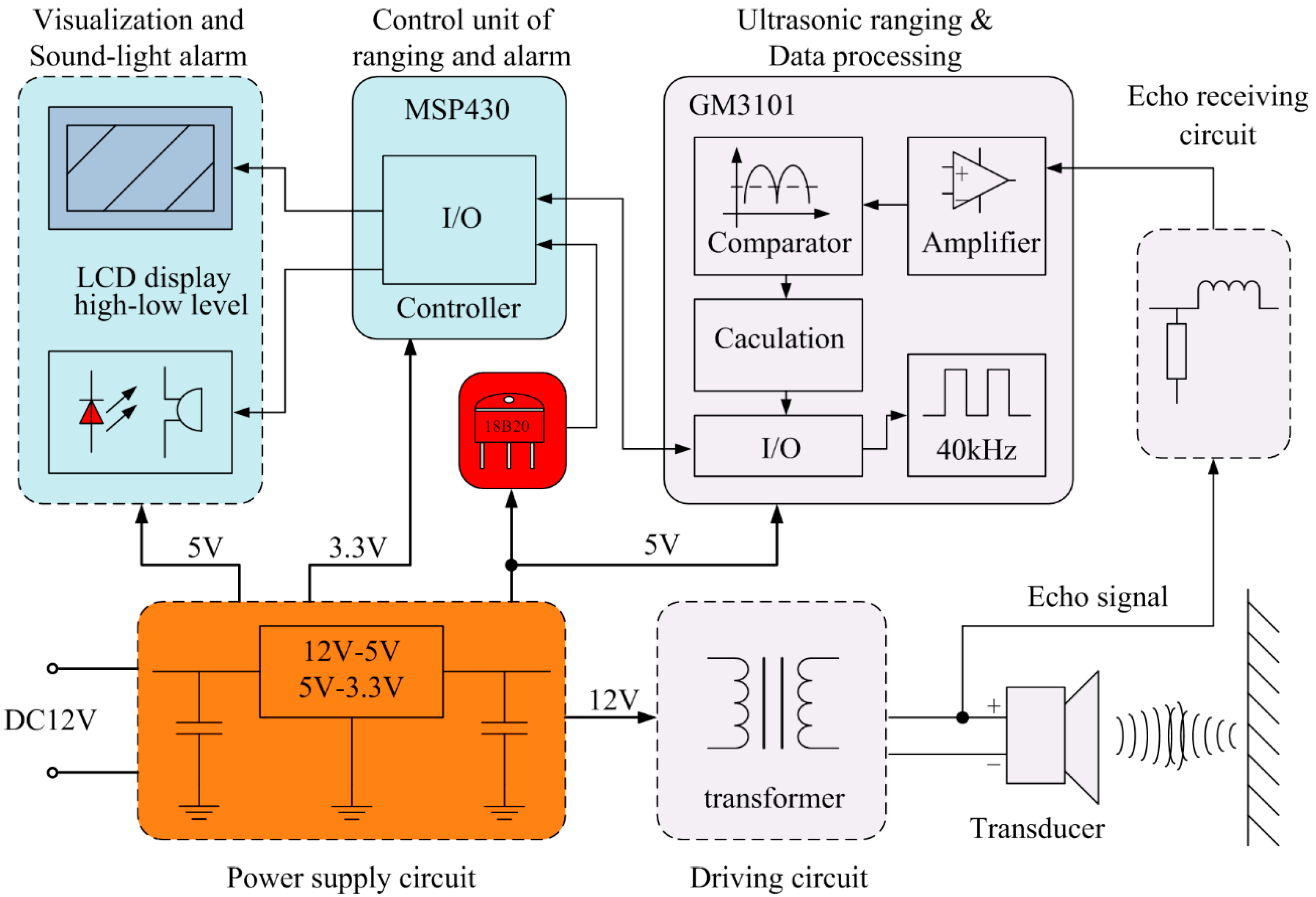 The block diagram of the ultrasonic ranging sensor is illustrated in Figure 1. According to the demands of ultrasonic ranging equipment, such as a reversing ultrasonic alert system, the system should have at least three transducer circuits at the same time due to the directivity characteristics of a single ultrasonic transducer, if not, it is difficult to detect a target outside the beam-angle. In Figure 1, only one transducer circuit is shown. The implementation of the other two is the same as this. As can be easily seen, the whole system is broadly composed of a power supply circuit, driving circuit, transducer, echo receiving circuit, ultrasonic ranging and data processing, DS18B20 temperature compensator (Dallas Semiconductor Inc, Dallas, TX, USA), ranging and alarm control unit, visualization and sound-light alarm.
