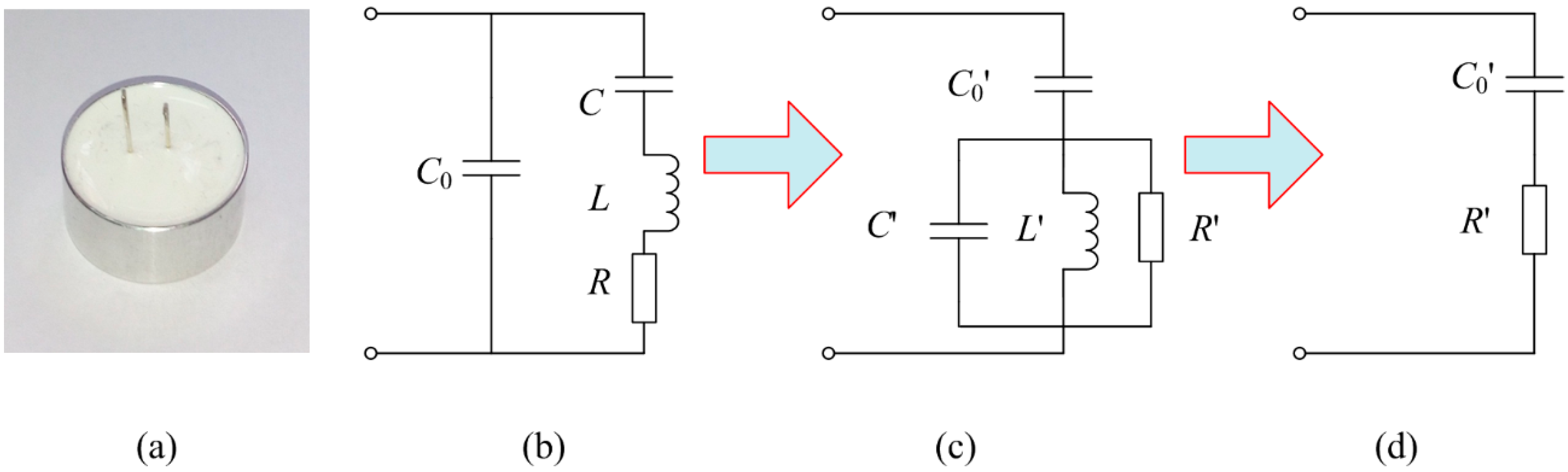 (a) The adopted ultrasonic transducer; (b) Internal equivalent circuit of ultrasonic transducer; (c,d) Equivalent circuit transformation when parallel resonant.
