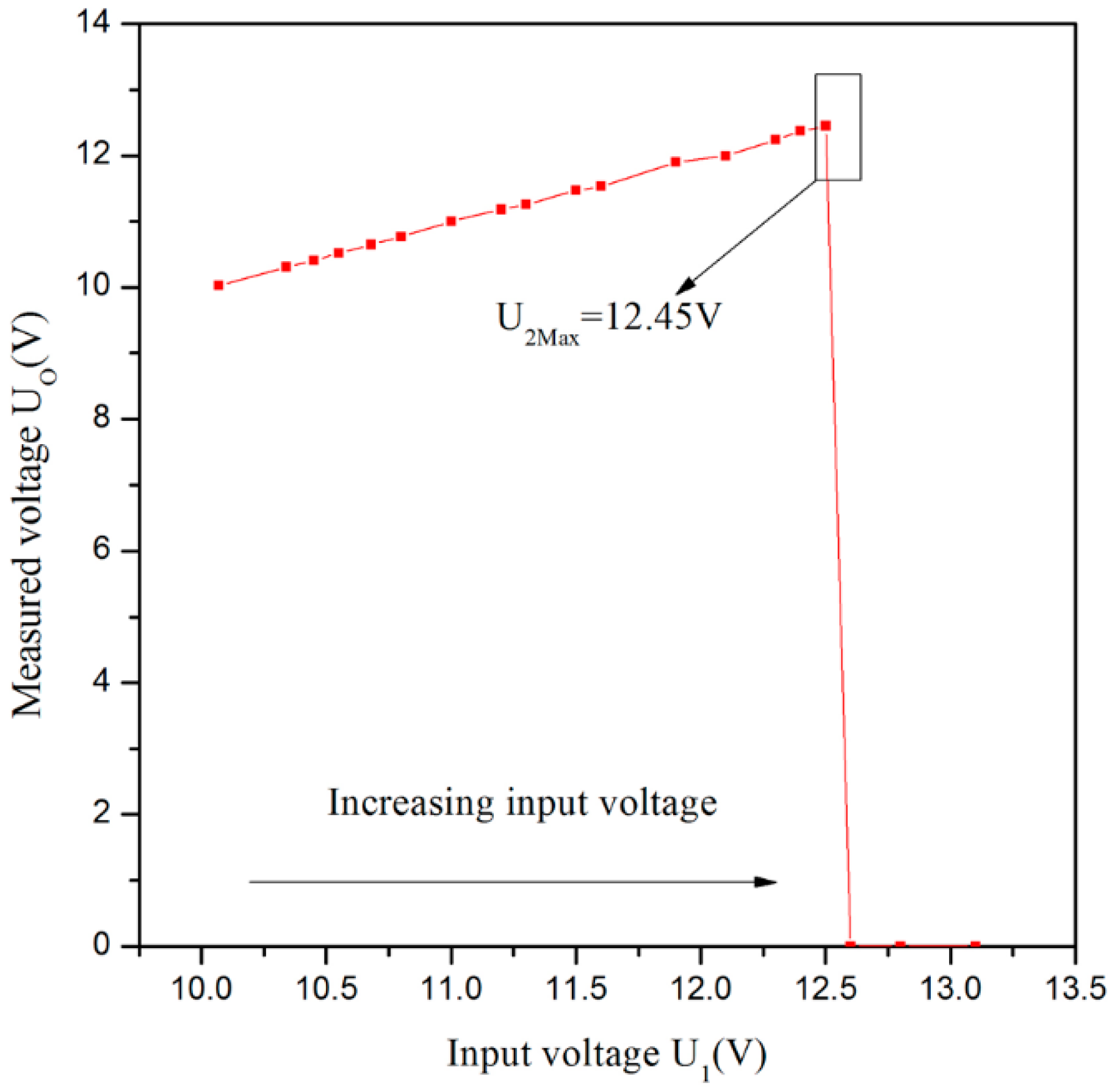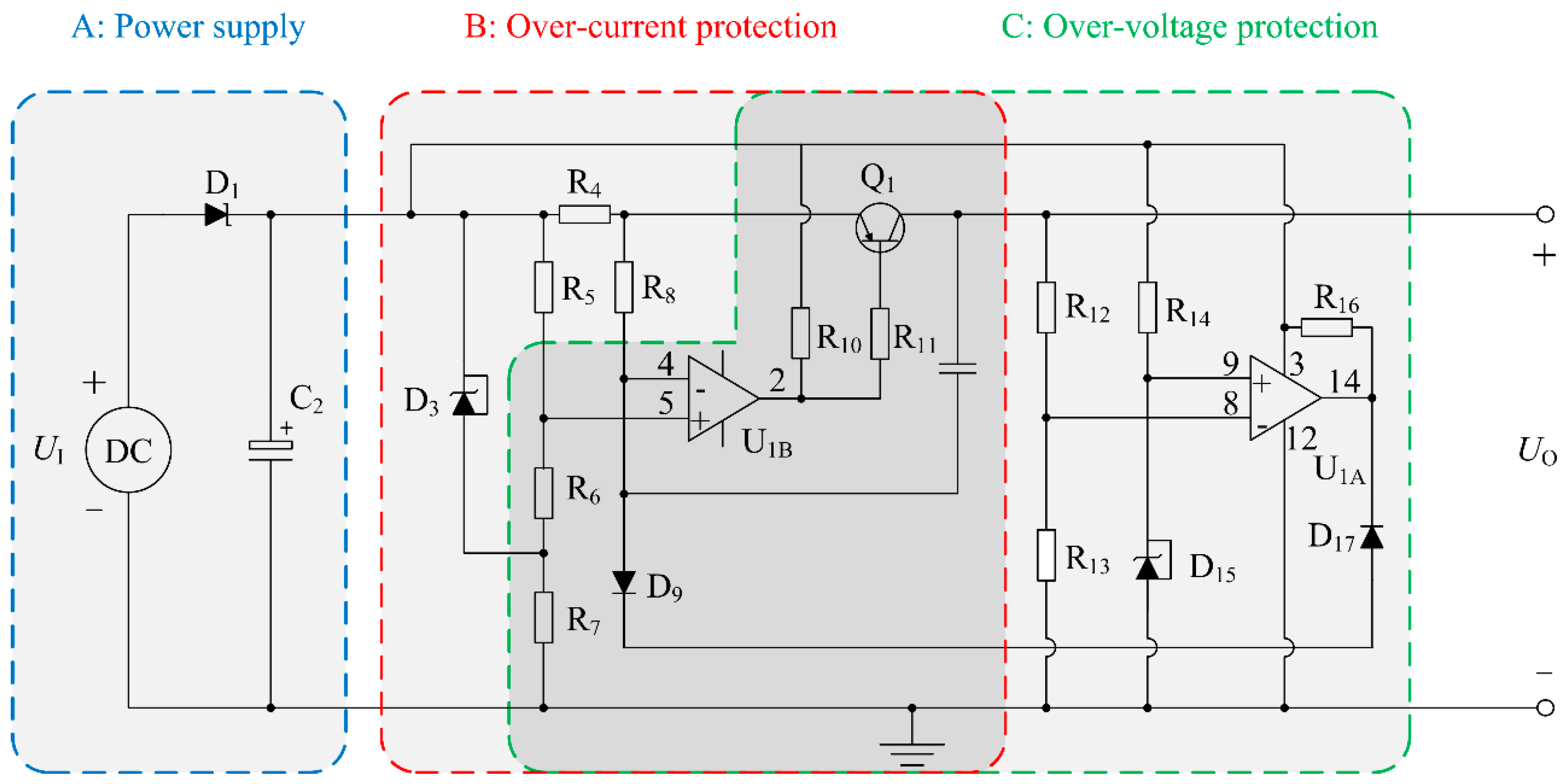 In the proposed sensor system, the threshold of input voltage UI is 12.5 V. After matching the suitable value of R12 with R13, the divider resistors U8 will achieve 2.5 V when the input voltage UI is 12.5 V. If the input voltage is higher than 12.5 V, it will lead to the result that U8 is greater than U9, and that the output voltage level of the comparator U1A will change from high to low. Hence, the inverting input end voltage of U1B will be pulled down through the circuits of D9 and D17, which will cause the base of Q1 turning to a high voltage. Then, the transistor Q1 is at an OFF-state, in which the power supply will be cut off to realize an over-voltage protection. From Figure 6, we can know that the output voltage UO will be 0 V when the input voltage UI is higher than 12.45 V.