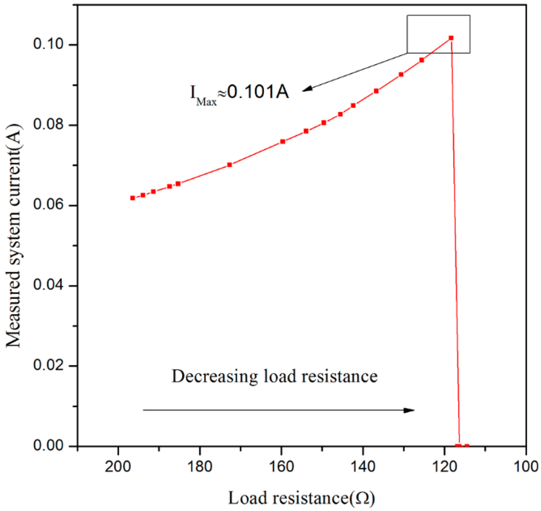 As the rated current of the proposed sensor is about 70 mA, the voltage of R4 is lower than 0.2 V under normal circumstances, so for the comparator U1B (LM339, Texas Instruments, Dallas, TX, USA), the voltage of its positive input end is lower than that of inverting input end, which will make the output voltage of U1B become low and Q1 be at an ON-state, but when short circuits and other faults occur, the system current is more than 100 mA. Furthermore, the voltage of R4 will be higher than 0.2 V, which will lead to the output becoming high and Q1 being at an OFF-state. Then, the power supply will be cut off so as to realize over-current protection. Figure 7 shows the maximum allowable current of sensor is 0.101 A.