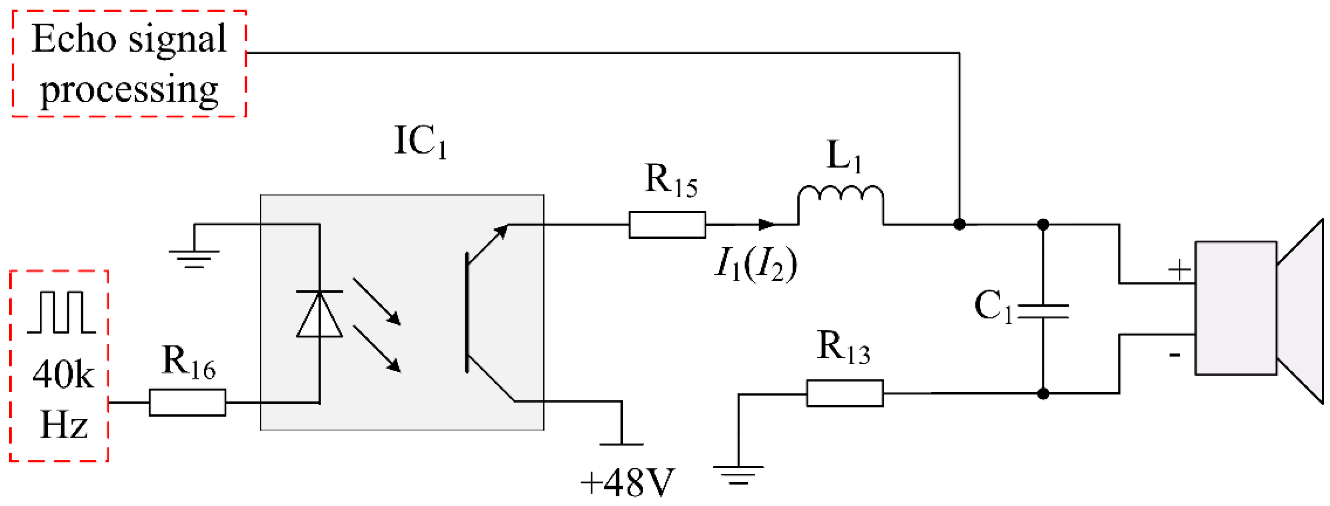 To solve the above issue, a transducer driving circuit with a high-speed opto-coupler has been designed. The proposed driving circuit is shown in Figure 8, where IC1 is the high-speed opto-coupler, and its switching speed can reach microsecond grade. Once the high speed opto-coupler closes, it can isolate the power supply from an echo signal completely. Therefore it is suitable for transmitting impulse signal and weak echo signal. At the same time, there is no energy storage element in the proposed driving circuit. It can be concluded that the proposed driving circuit meets the requirement of an intrinsically safe circuit based on the above calculation and analysis. The sparks safety assessment of transducer’s matching circuit and drive circuit can be seen as follows: