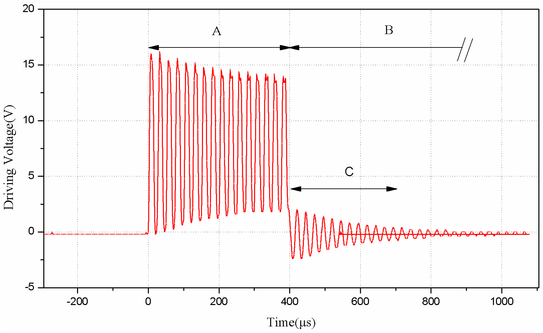 The transmitting pulses produced by the novel approach of driving current are shown in Figure 9. Due to the resistance distribution of current limiting resistor and opto-coupler, a pulse string, composed of about 16 V and 40 kHz pulse signals which is controlled by GM3101, will be sent to the anode of the transducer. The time of the stage A, when the sensor is transmitting pulses, is TA = 16 × 25 μs = 400 μs. After transmitting the pulses, the microprocessor will turn off the opto-coupler and the transducer will go to the stage of aftershock (C) before the echo receiving stage. In order to distinguish the aftershock signal and the echo signal, a period of aftershock shielding time is necessary, after which the proposed sensor begins to detect an echo. In Figure 9, B represents the stage of aftershock shielding. Obviously, TB is much larger than TC. After designing and implementing the driving circuit, we take a waterproof piezoelectric transducer with an integrated transceiver for experiments to test its driving ability. Tests have been done in various distances of the target object, and the echo waveform in 185 cm is shown in Figure 10. We can find that the echo voltage is still very large (about 1.75 V) in such a long distance, which shows that the proposed novel driving circuit has a pretty good performance in driving the waterproof piezoelectric transducer with integrated transceiver.
