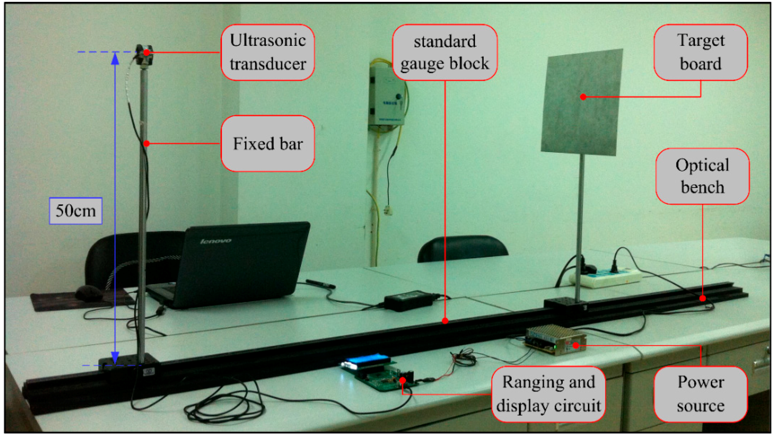 An ultrasonic transducer and target object were placed on an optical bench (300 cm in length) with an easily readable distance scale so that the actual distance value was controlled and read precisely by a simple way. In order to avoid the effect of other objects, the transducer and target objects simulating explosion-proof enclosure (25 cm × 25 cm) were fixed at an altitude of 50 cm by two metal rods. The 12 V switching power source provided basic electrical power for the proposed distance measurement sensor. Three types of measurements were performed.