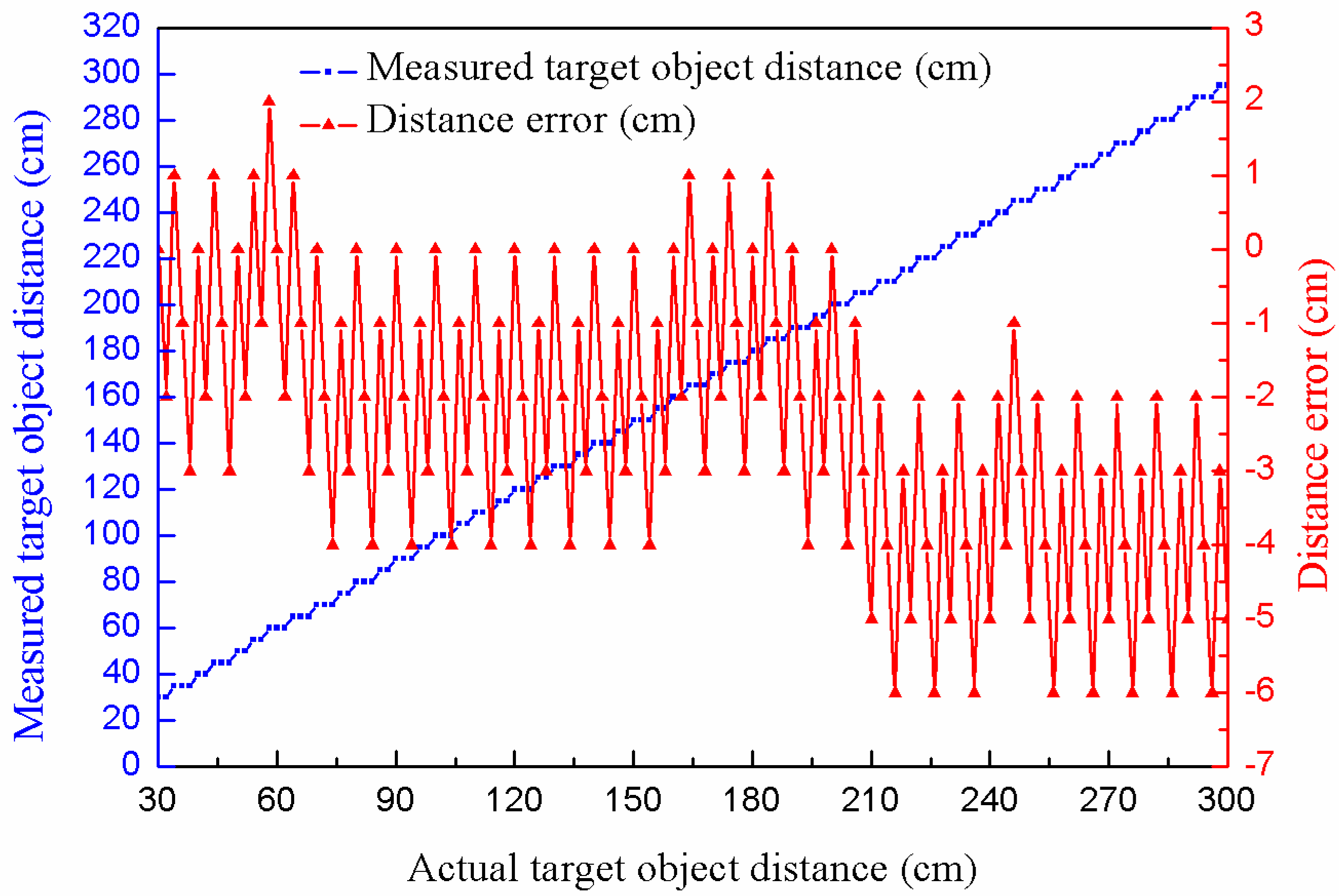 where DB is the distance of measuring blind area, C is the speed of sound and TB is the aftershock shielding time. Experimental results of the linearity test in a measuring range of 30 cm to 300 cm are shown in Figure 14. In Figure 14, it can be seen that the maximum error of this test is about −6 cm or 2.22% within the full scale span (FSS).