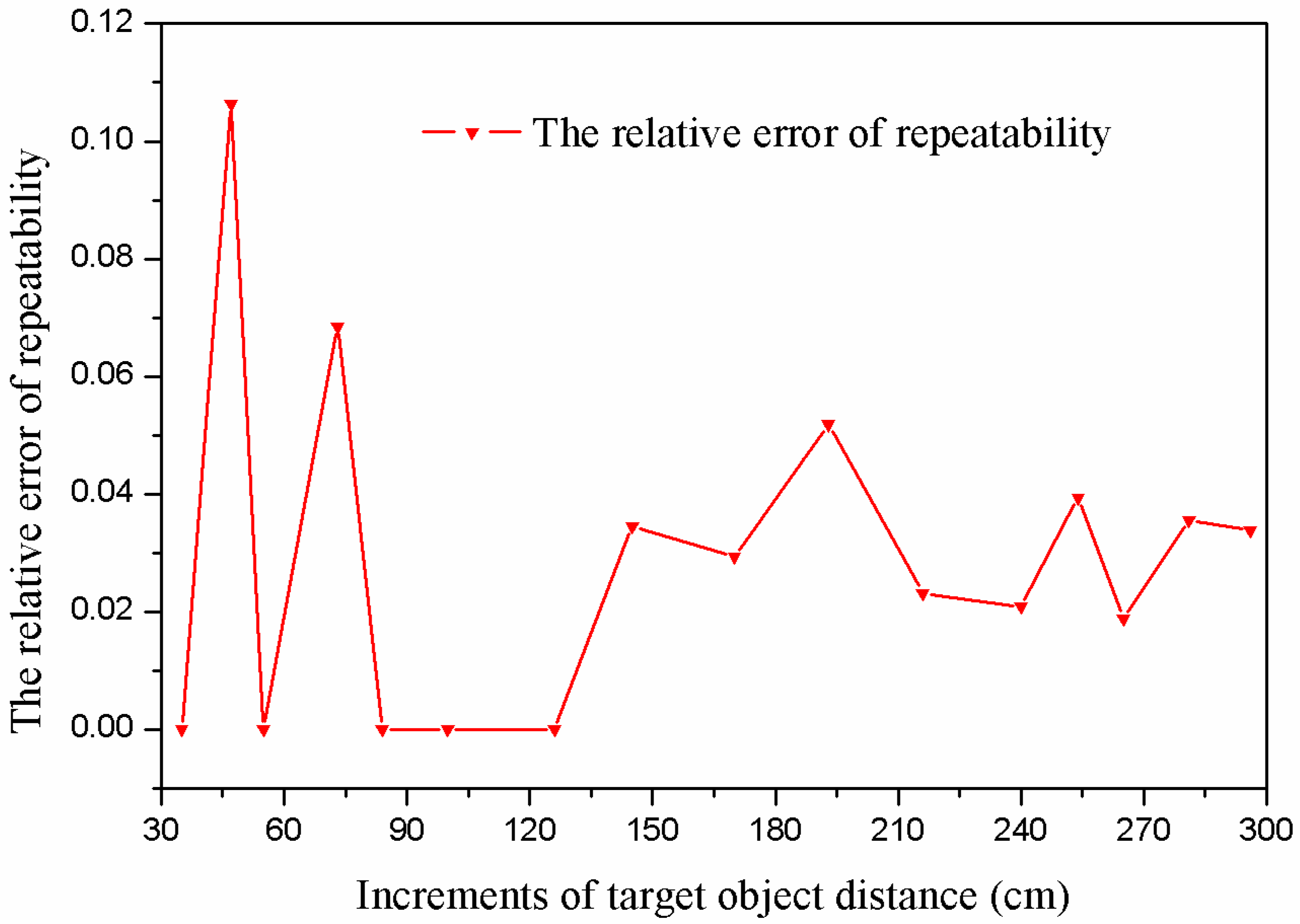 In the experiment, at each fixed target object distance, ten measurements are carried out repeatedly. It is observed that there is a small variation among the measurement results. After the measured data are processed, the relative error of repeatability of each sample point can be obtained and is shown in Figure 15, respectively.
