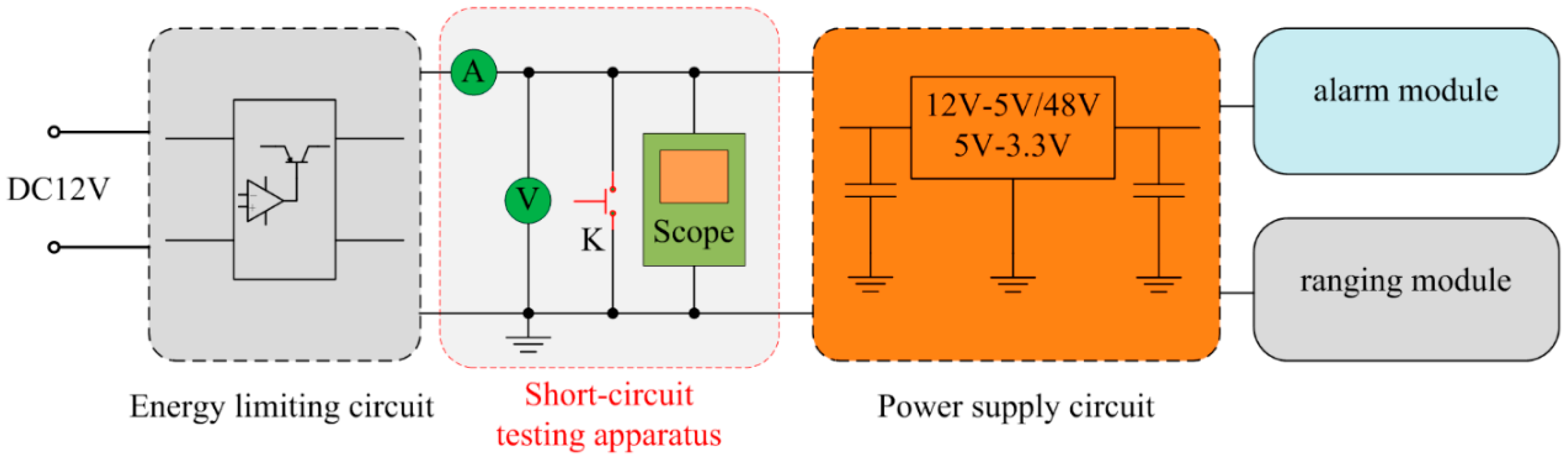 In order to verify the intrinsically safe feature of the proposed ranging sensor, we have carried out a short-circuit test. The output terminal of the energy limiting circuit is selected as the short-circuit point because the power source short circuit is the worst case. The test scheme is shown in Figure 16.