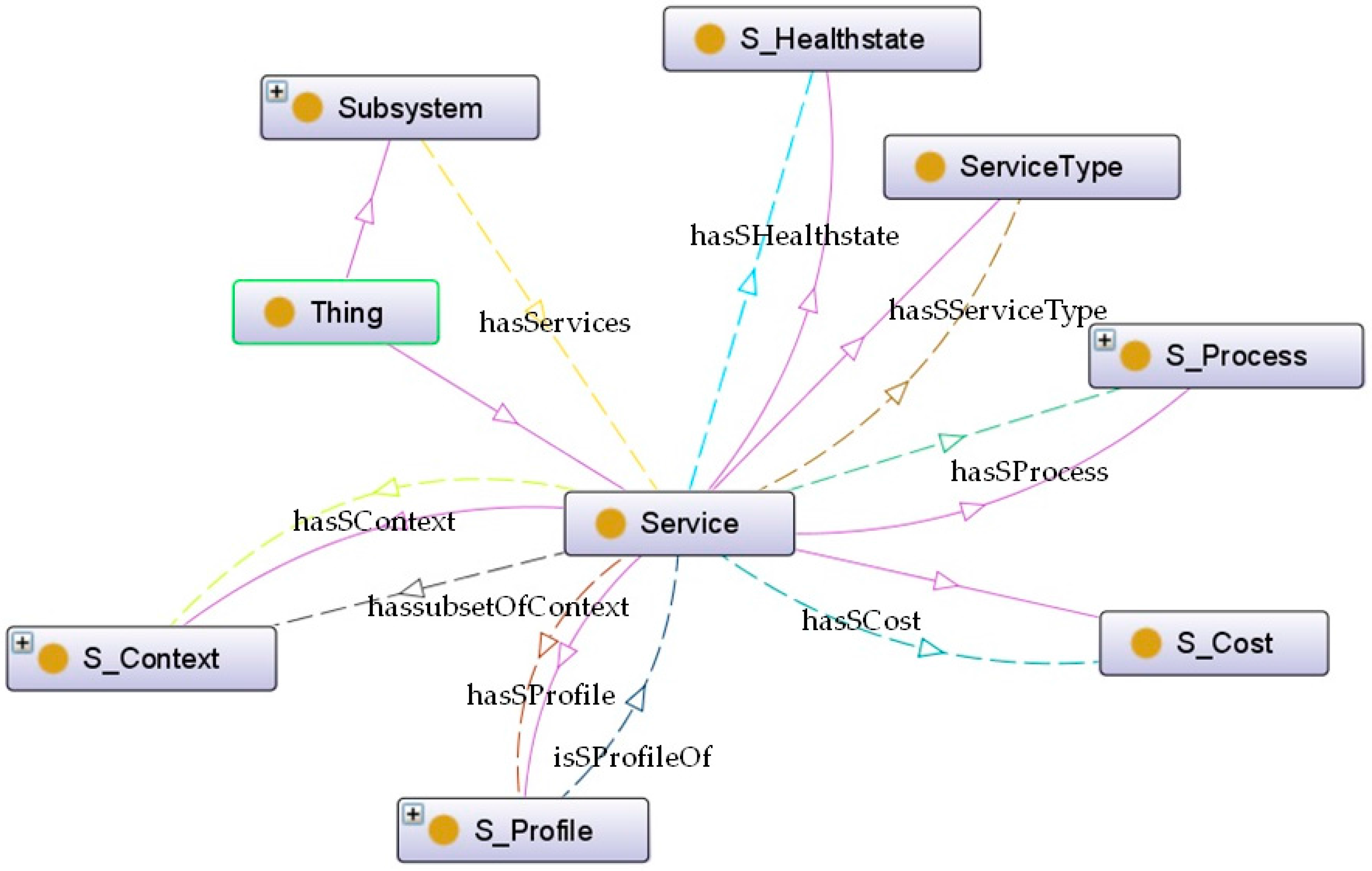 The most coarse-grained concepts are Subsystem and Service, which form the entire nSSOO ontology. In the following, the top-level concepts of Subsystem and Service, as shown in Figure 4, are broken down and their associated subclasses are explained in detail, along with descriptions for relationships/object properties which reflect the connections between them with the aim of providing a better understanding of the whole proposal. The primary principle of designing the nSSOO ontology is assigning different concepts with intuitive terms so that their meanings and intentions can be easily revealed. To make a clear distinction between service- and subsystem-owned ontology elements, prefixes “S_” and “SS_”, as abbreviations of service and subsystem, are attached to the corresponding ontology elements.
