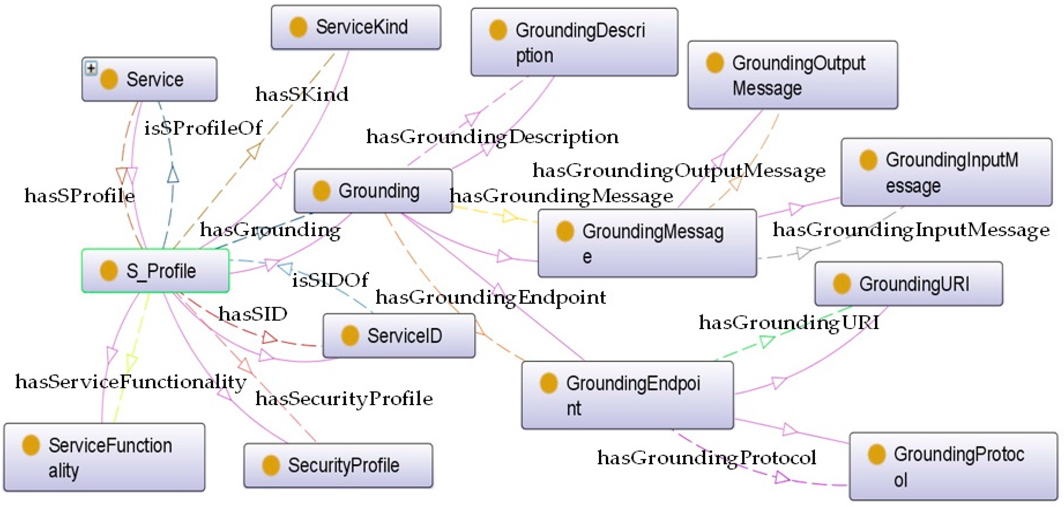 - S_Profile. Service is interrelated with the S_Profile class via hasSProfile and isProfileOf relationships. Different features of the service are described and attributed in S_Profile. As shown in Figure 9, S_Profile states the ServiceID (a unique identifier for distinguishing the service), the ServiceKind (a more detailed specification for the type of service which differentiates it from the ontology's point of view, being either ACCUS-compliant or non-compliant, having the service using another ontology or not), the ServiceFunctionality (description of what the service is capable of doing), the SecurityProfile (description of the security features under which the service will be provided; this concept can be further extended by NRL), and Grounding (particular protocols used between the service and service consumers). Regarding the Grounding concept, it contains a more specific description (GroundingDescription) of the protocol, the URI (GroundingURI) and the protocol (GroundingProtocol) of the endpoint where the application is running and also the input (GroundingInputMessage) and output (GroundingOutputMessage) messages exchanged between the service and service consumers (see Figure 9).
