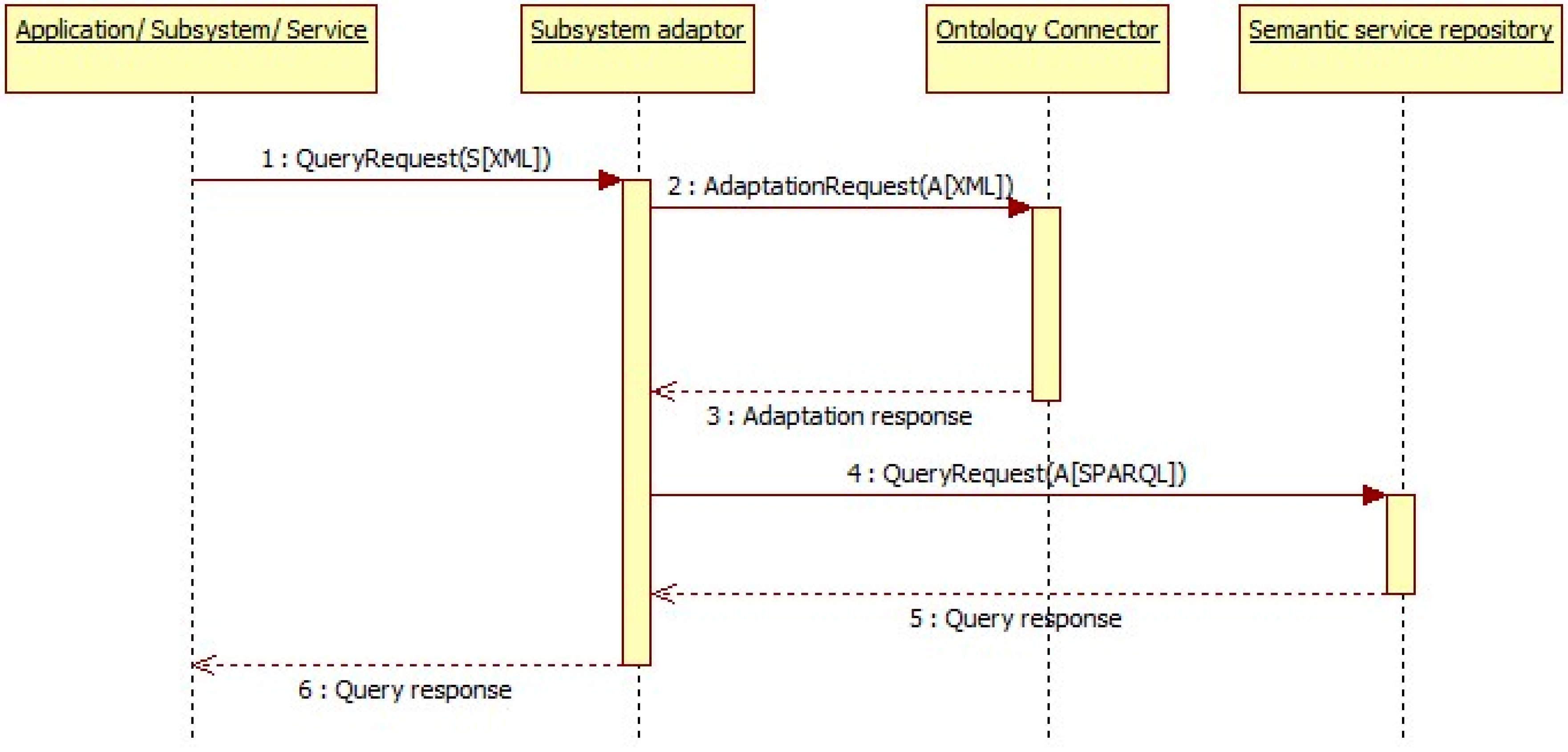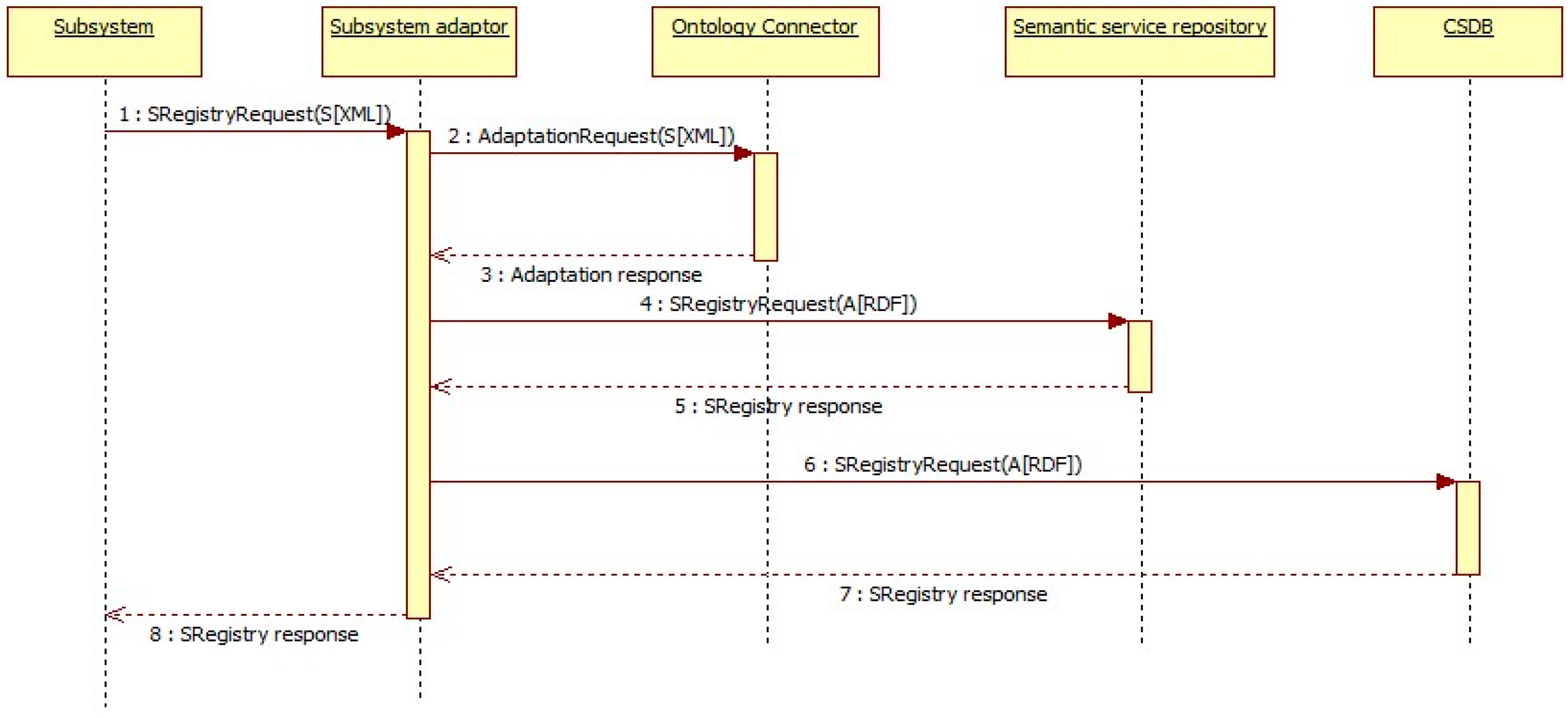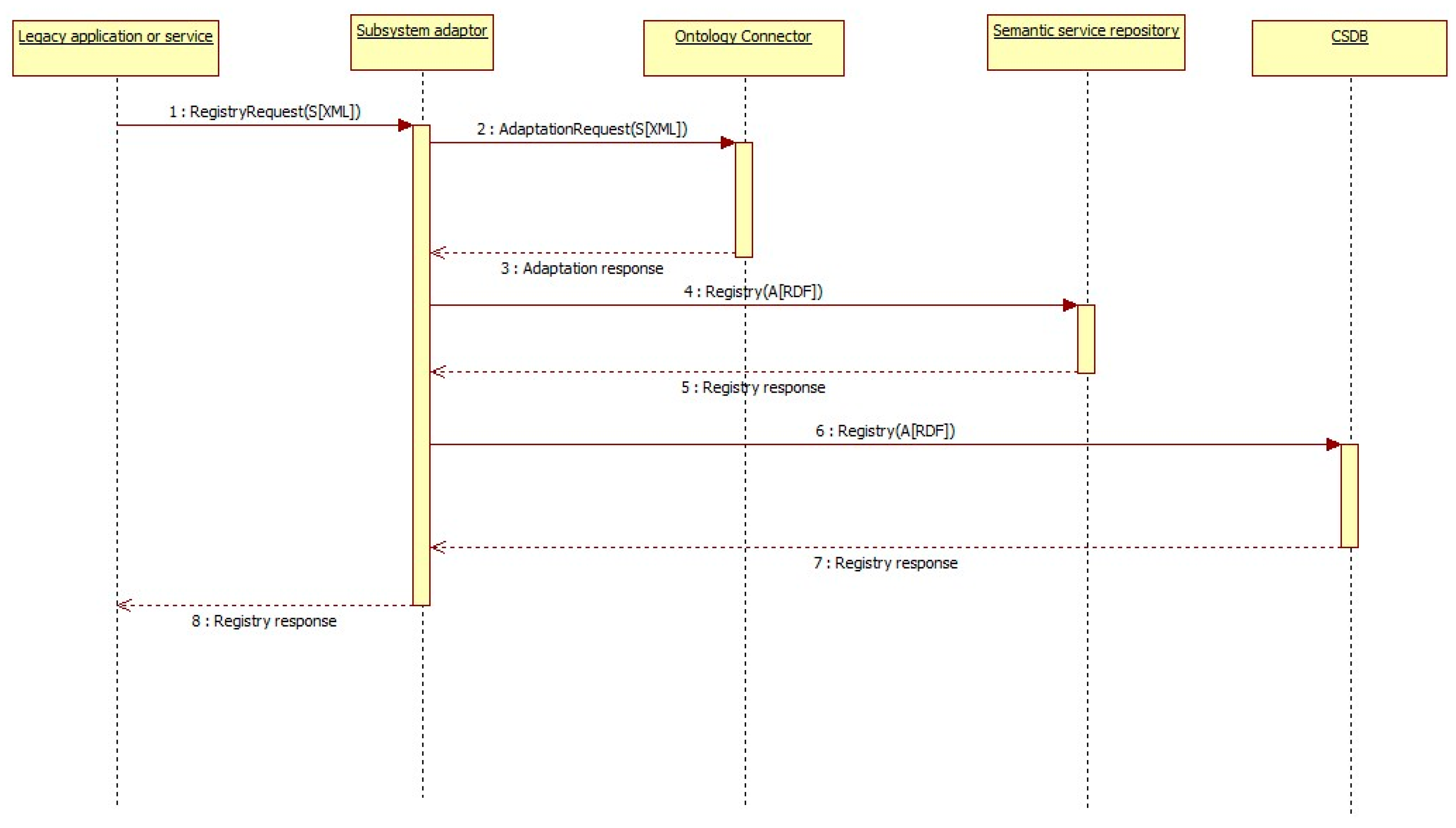When a subsystem becomes registered in the ACCUS ICP, all legacy applications and services provided by the subsystem must be registered. As shown in Figure 12, first, each legacy application or service sends a registry request to the ACCUS ICP which includes the service profile in an XML document. Service profile contains information about the service or legacy application, such as service type, functionality or information about the operations that the service can do, along with the input and output parameters involved in each operation. This information is not compliant with the ACCUS ontology, so it must be adapted to the ACCUS ontology for the service registration to have it stored in the semantic service repository as well as in the CSDB.