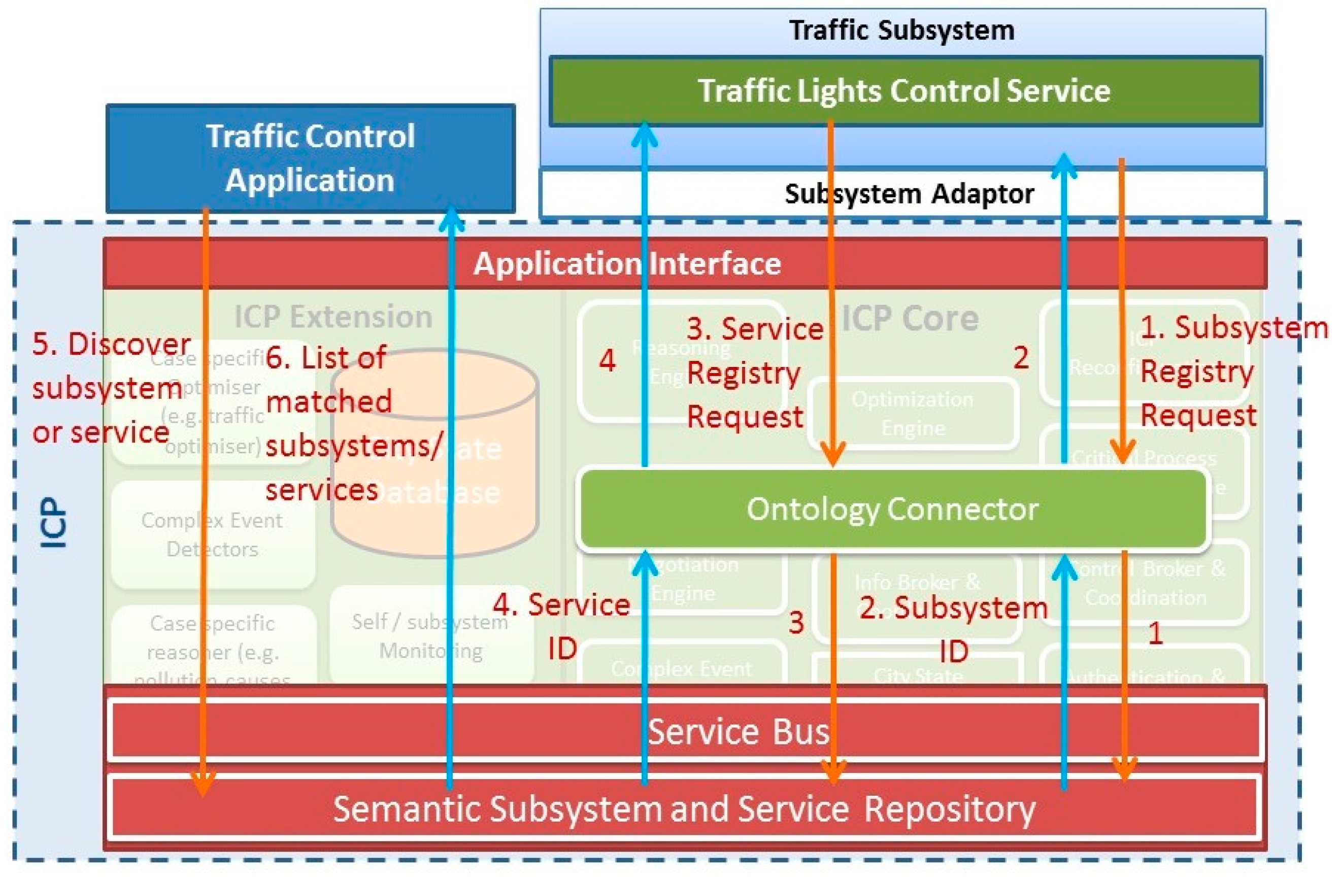 This paper is organized as follows: Section 2 presents related work on existing platforms for Smart Cities and their solutions to register and discover subsystems and services within them. The proposed system for registry and discovery of subsystems and services within the ICP is shown in Section 3. Specifically, Section 3.1 highlights the main contributions that are provided by this paper. Section 3.2 shows system integration regarding Semantic Interoperability right afterwards. The newly proposed nSSOO ontology used to model the registry and discovery information base is introduced in Section 3.3. Section 3.4 provides a holistic view of the system and elaborates the specific software components that are involved. Workflow for the subsystem and service discovery and registration procedures is detailed in Section 3.5. Section 4 presents a use case about the traffic light control to validate the proposed system. Finally, in Section 5, conclusions are given and future work is pointed out as well.