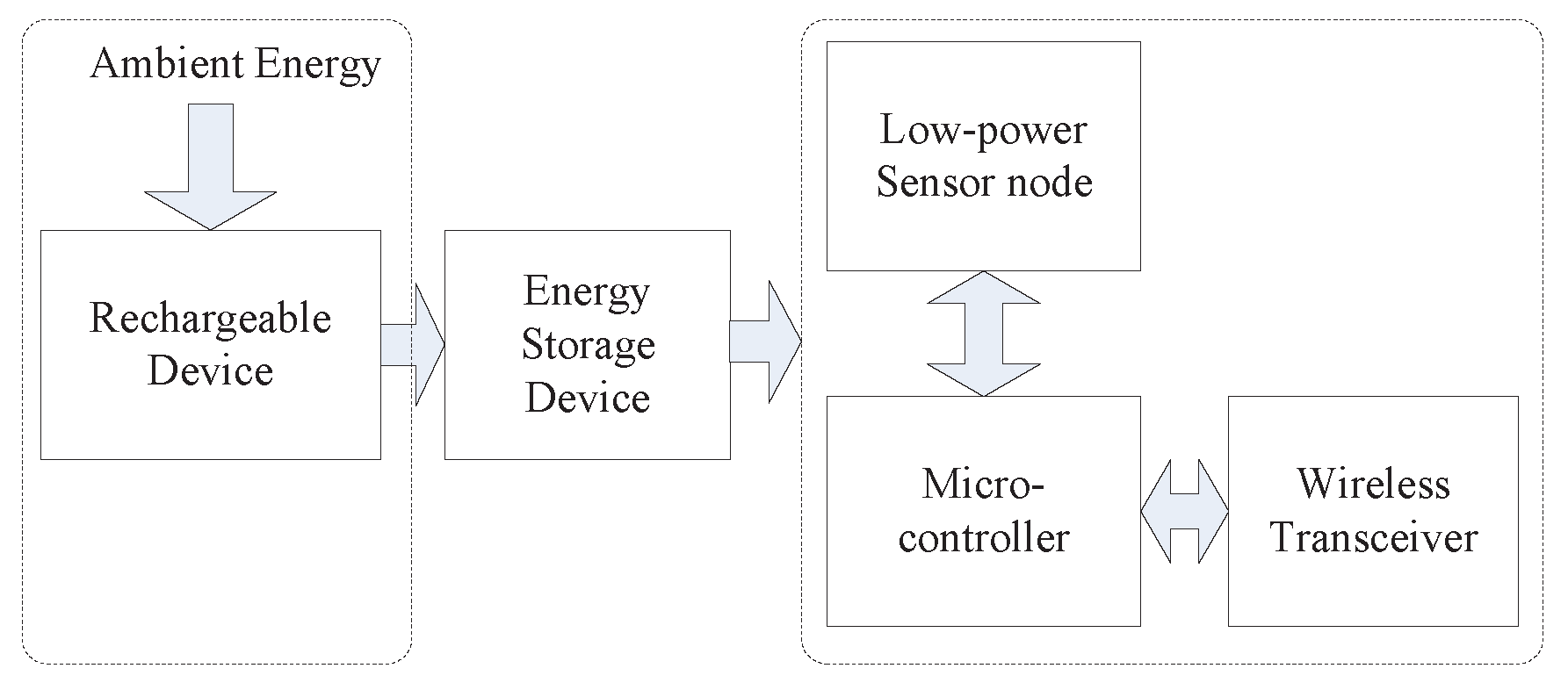 In WSNs, since researchers have not made breakthrough progress in battery technology, a fundamental problem is the limited lifetime of sensor nodes due to limited and fixed energy supplement [7,8]. Note, it is generally accepted that the usefulness of a wireless sensor expires when its battery runs out. A significant amount of work has been carried out across the protocol stack to prolong the sensor’s lifetime by saving energy [9,10], including duty-cycling strategies [11,12] and Medium Access Control (MAC) protocols [13,14]. However, it is inevitable that the energy will be exhausted and sensors have to be discarded because it is generally impractical to render servicing for sensors. Meanwhile, it is inevitable that the accumulation of discarded batteries will contaminate the environment.