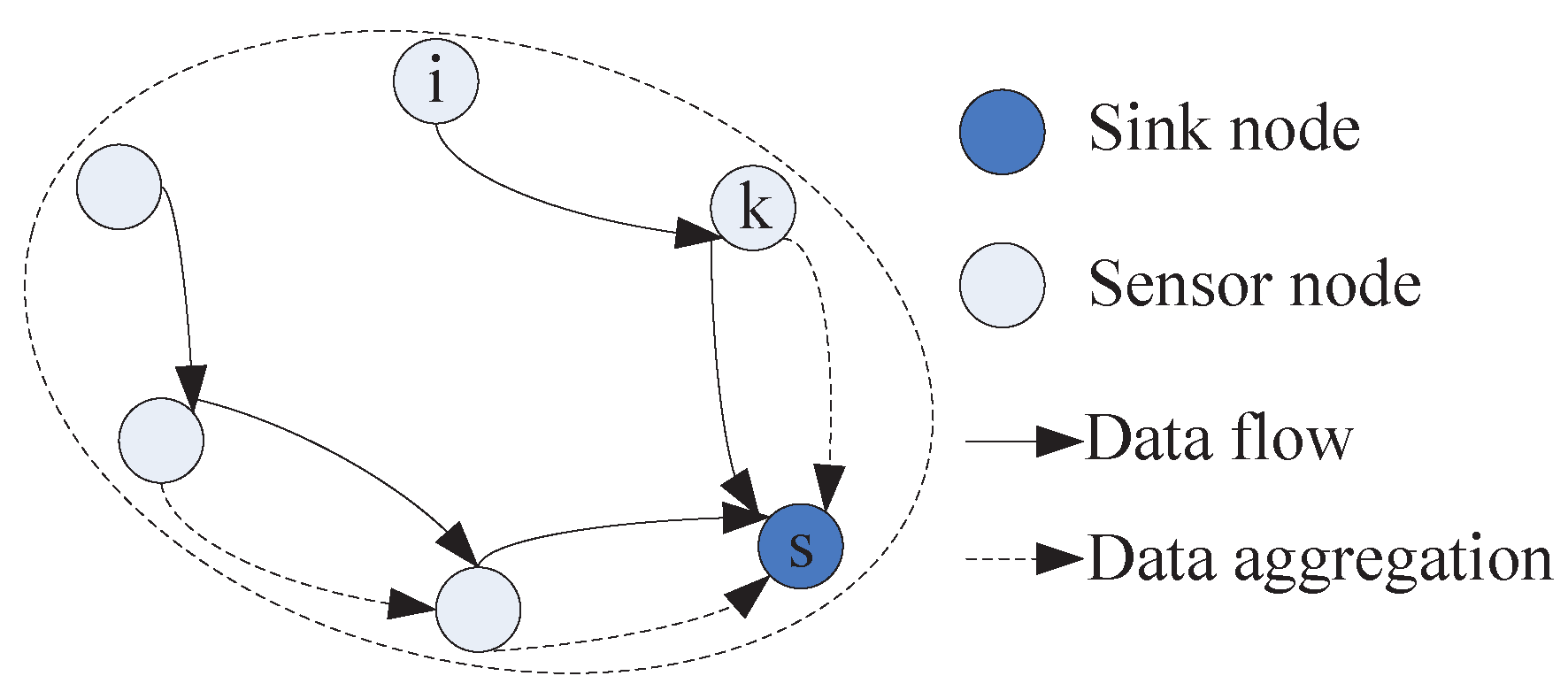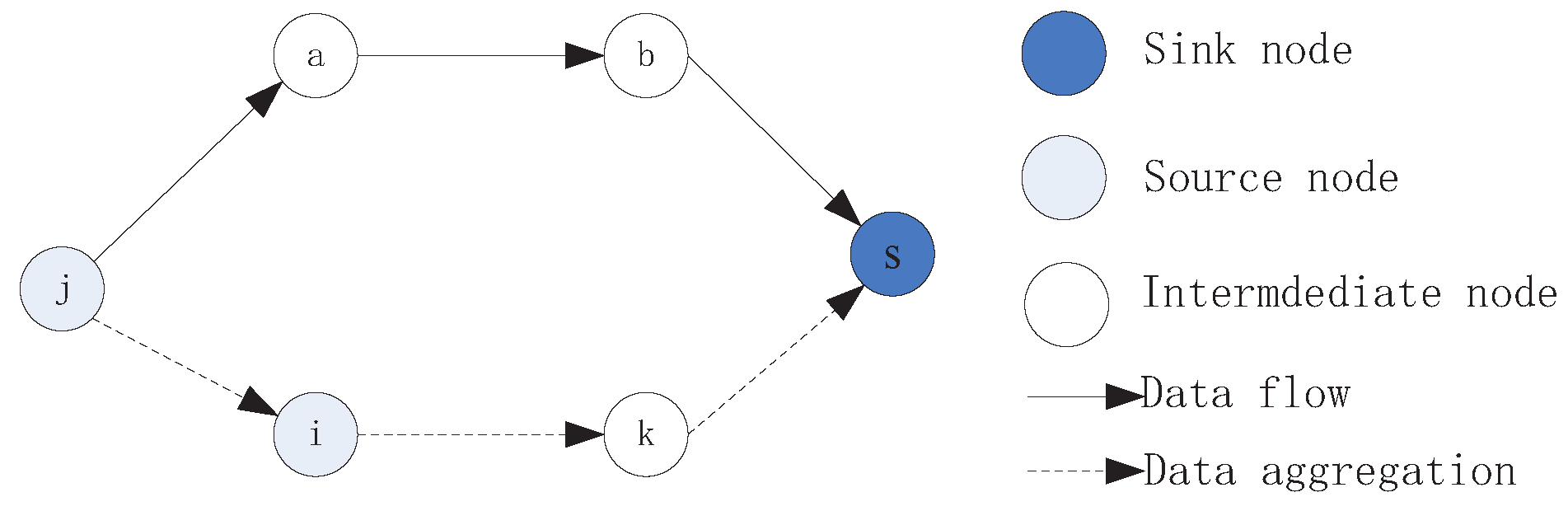 We assume node j and node i are source nodes and generate packets by sensing the environment periodically. There are at least two transmission schemes for delivering packets to the sink s. One of them is that packets can be forwarded along the link path , where sensor i aggregates the packets from an upstream neighbor j with its self generated data and forwards it to the next-hop adjacent sensor until reaching the sink s. This scheme is widely and recognized and used in traditional WSNs, which can reduce the amount of packets by removing redundant information and reducing energy consumption, effectively contributing to extended network lifetime.