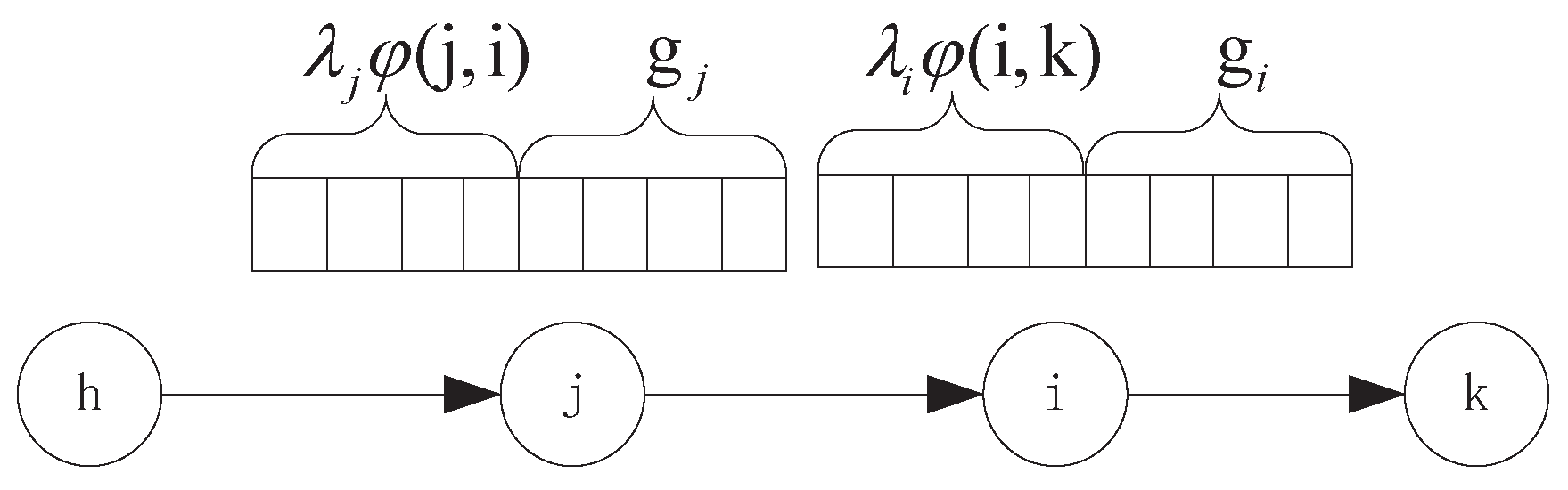 In R-WSNs, in the process of data transmission from packets generated by source nodes to these packets accepted by sink, packets will be encoded and aggregated in each sensor with local packets for reducing the data traffic. We let denote the data aggregation rate of node i and denotes the aggregated transit traffic rate at node i from its upstream node j. The aggregated transit traffic of node i is a superposition of two parts: the transit traffic passed from the upstream nodes, and the raw data originated from the upstream nodes that is to be encoded using the local information, as shown in Figure 6. That is,