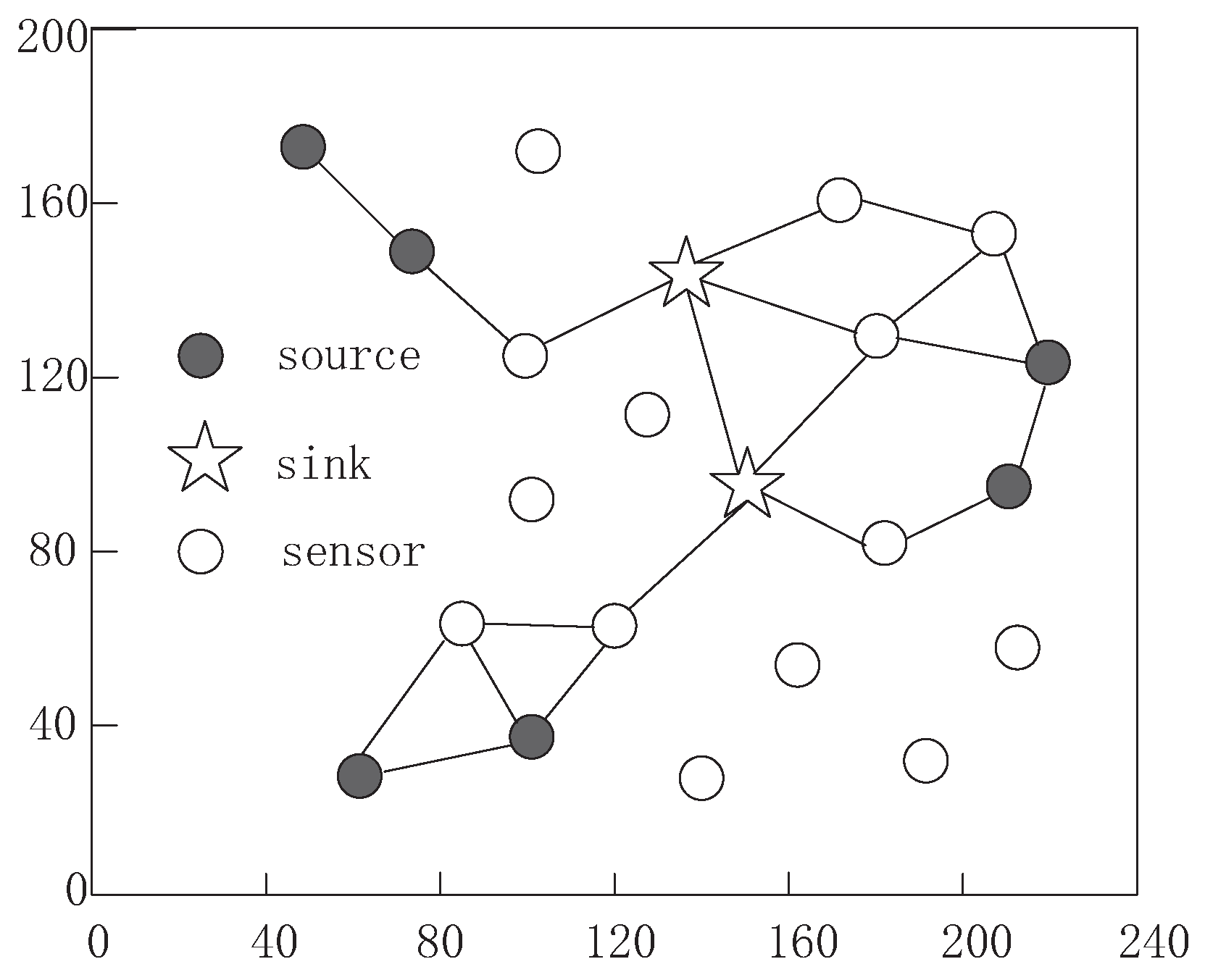 Figure 10 and Figure 11 show the routing paths established using different communication models when 20 sensors and 2 sinks deployed in experiment scenario with a 200 m × 240 m square area, which contains 6 source nodes, a sensing signal and other sensors undertaking forwarding tasks. Figure 10 presents the routing paths for all sources to reach at least one sink based on maximum data collection rate of our algorithm. By considering the limited energy supplement, a source node still chooses a closer base station as its destination; however, the packets from sources may travel through all intermediate nodes and the energy consumption will be balanced to all nodes in order to improve sensor usage efficiency.