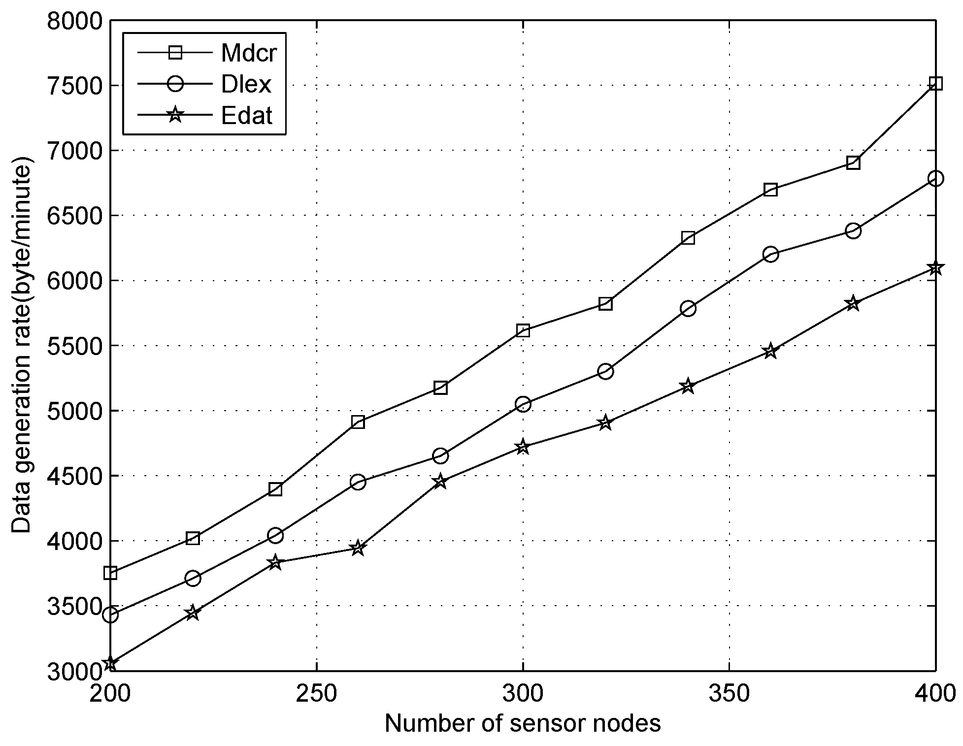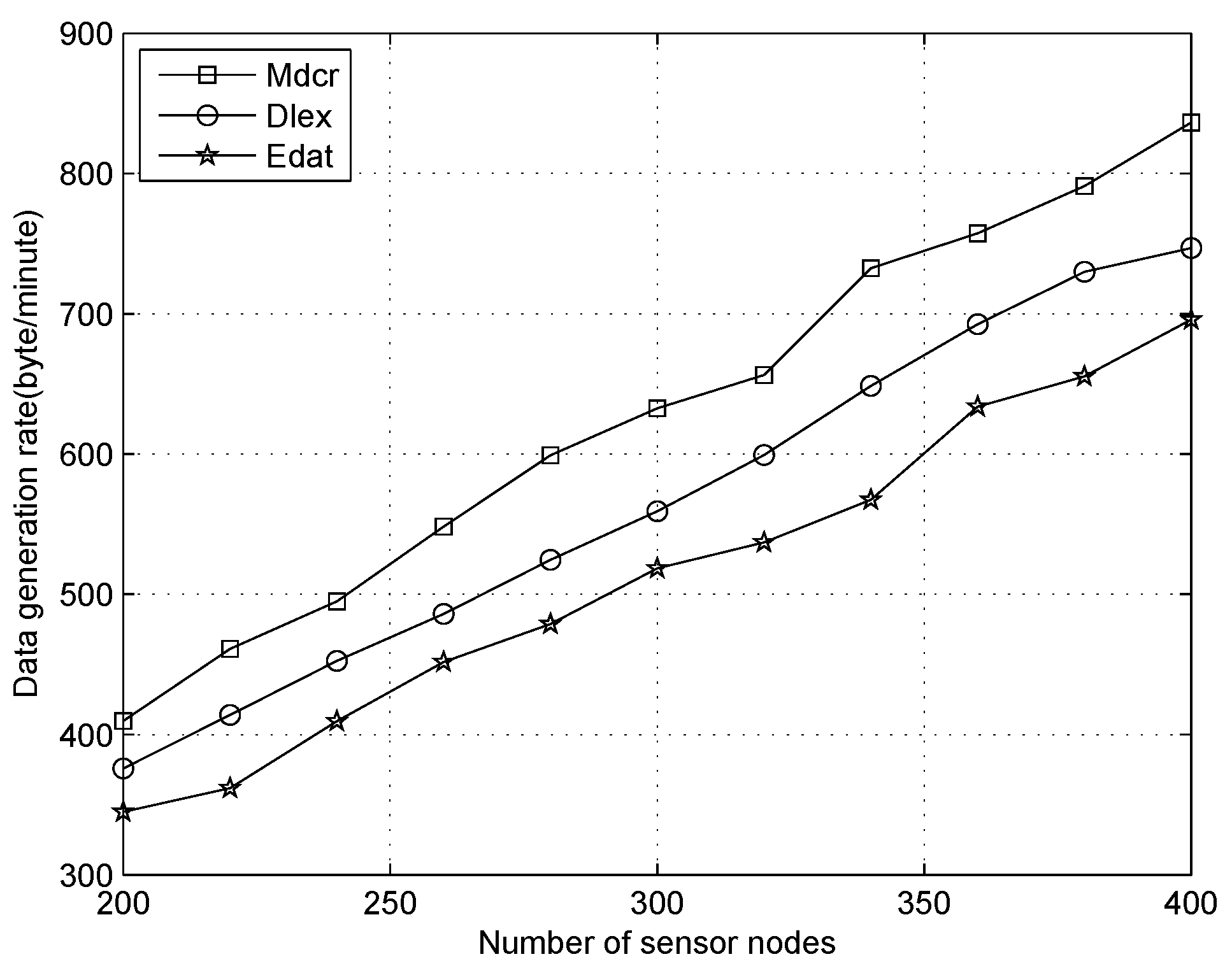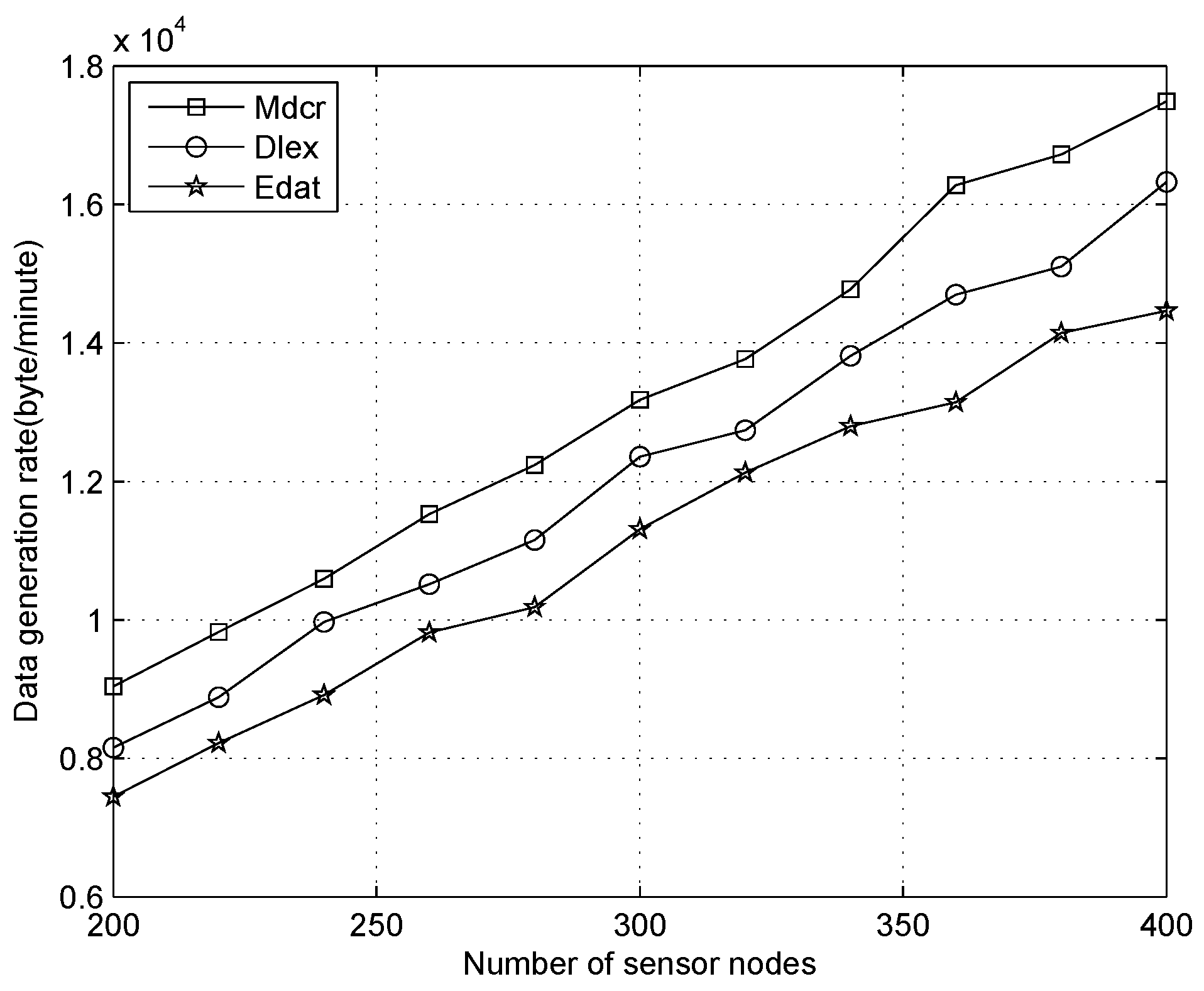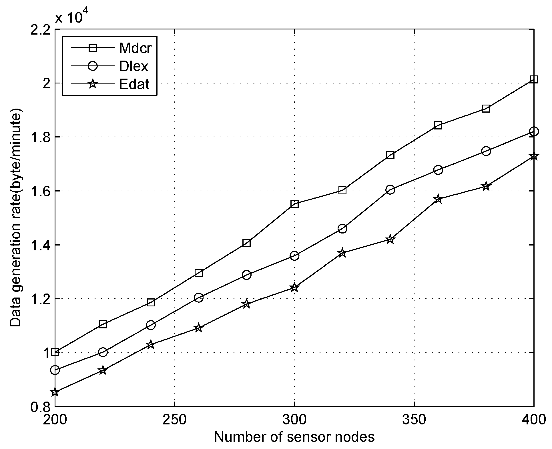 With improving α, the data correlation and the data redundancy decrease, which indicates that the data variance increases, such as, packets come from two sensors with long distance or different scenario. Hence, more packets will be transmitted to the sink and data aggregation rate is also improved. When , the data correlation coefficient and data redundancy are relatively high, packets can be compressed with high ratio and data collection rate increases due to a decrease in the power being used for data forwarding. While , the data correlation coefficient is low, which indicates that the packets are very different to each other and data is hard to compress. Therefore, original raw data will be forwarded to the sink and there will be more power expenditure for this procedure, which causes low data generation rate.