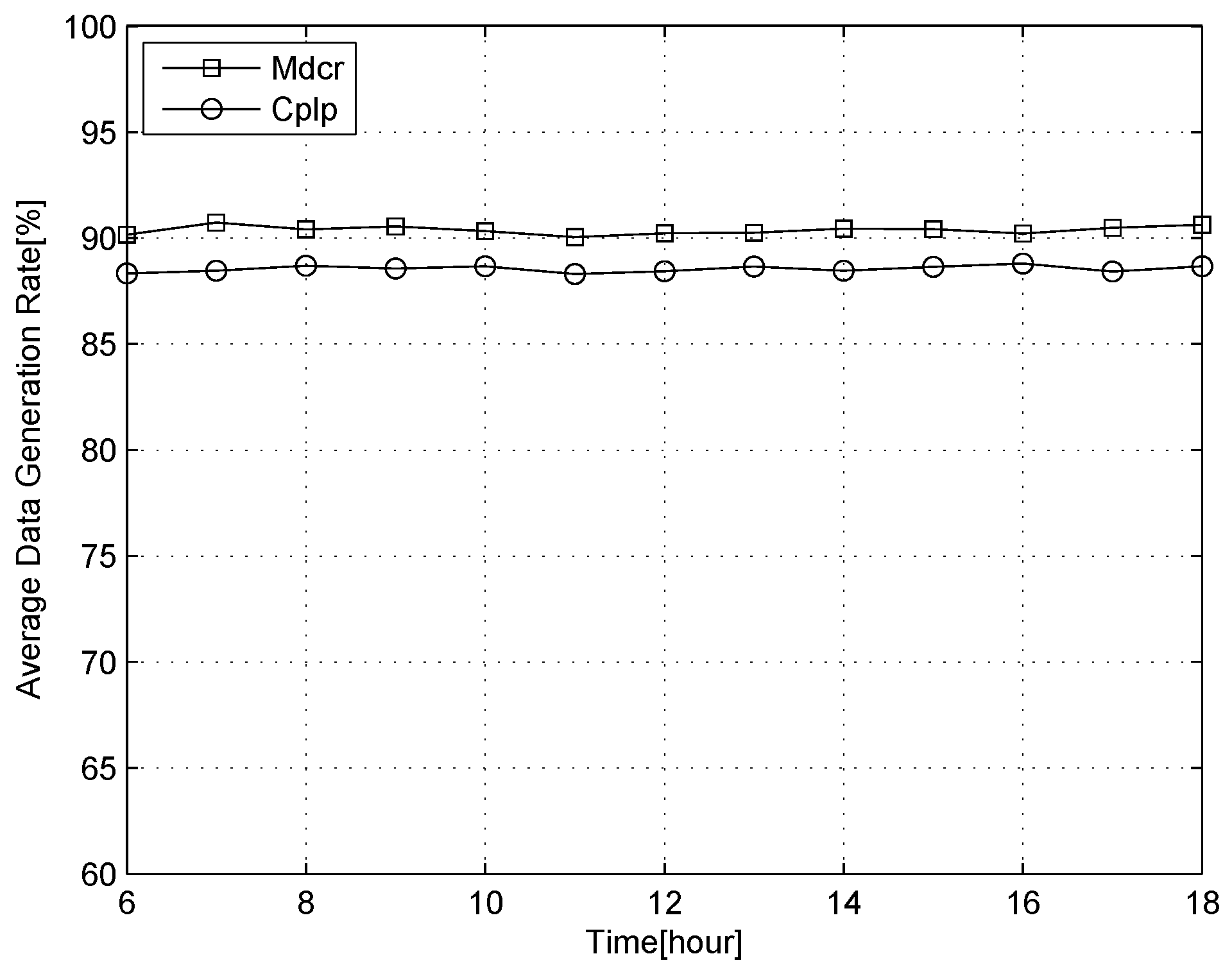Figure 18 shows the comparison of the average data collection rate for a day when the probability of a sunny day is high in our scheme and in [72], which can be abbreviated as Cplp (Cooperative repeater for low power WSNs). We can see that the average data collection rate of the scheme sustains a high lever compared to Cply on a sunny day. This is because the topology controlling techniques are utilized for adjusting its communication paths continually, while this method has been considered in Cplp.