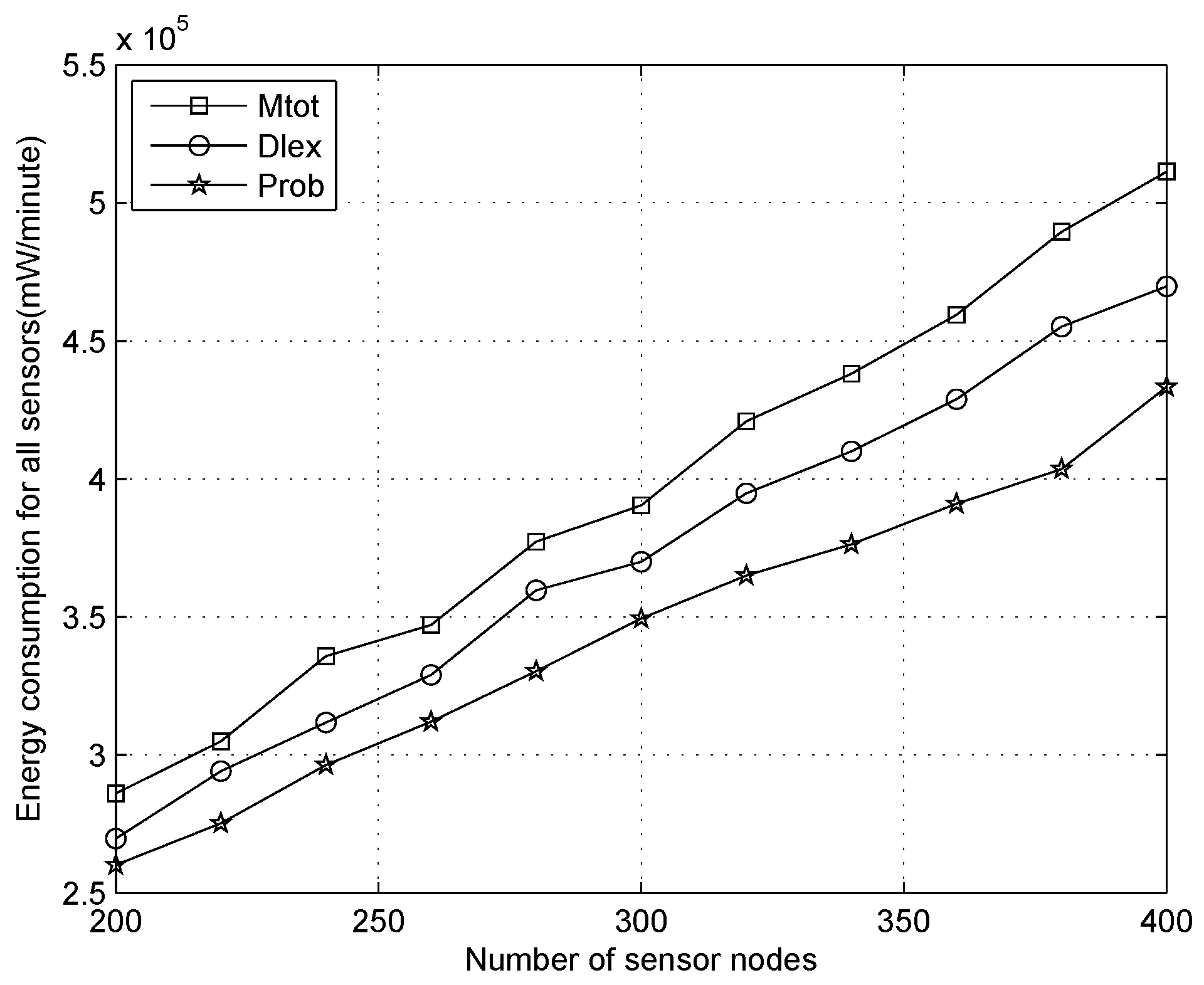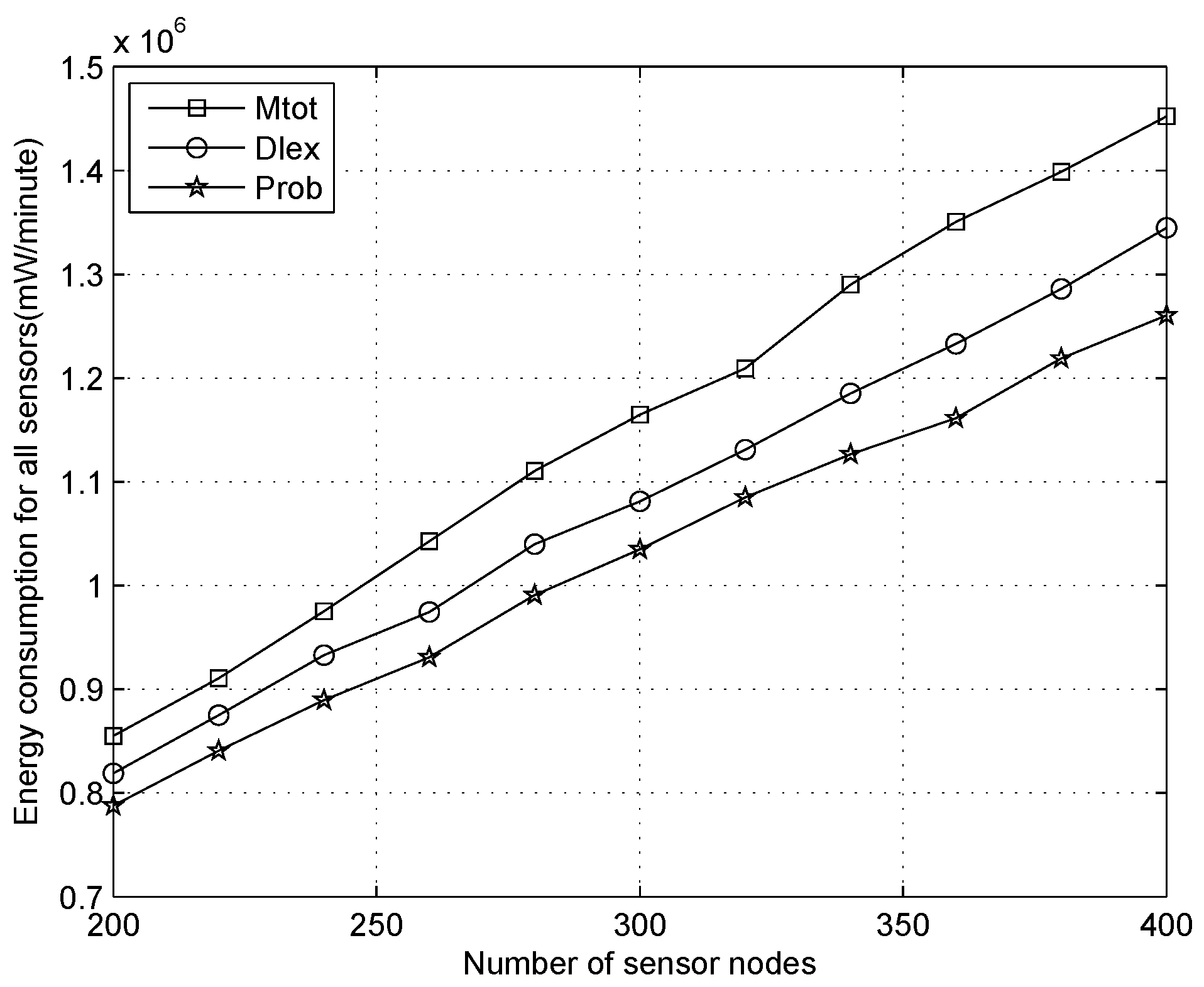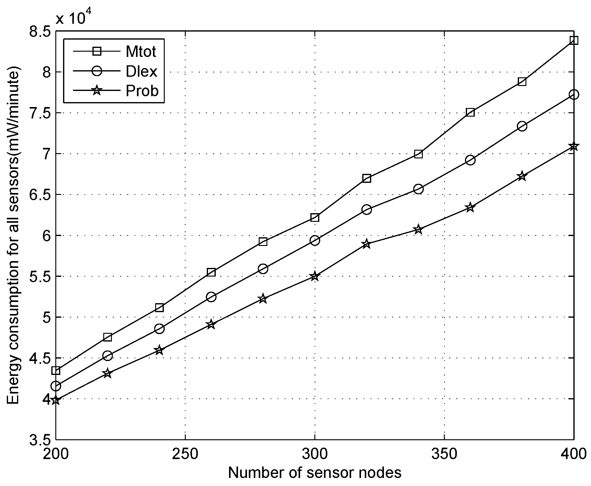 Energy consumption with the number of sensor nodes increasing when the duty cycle is .