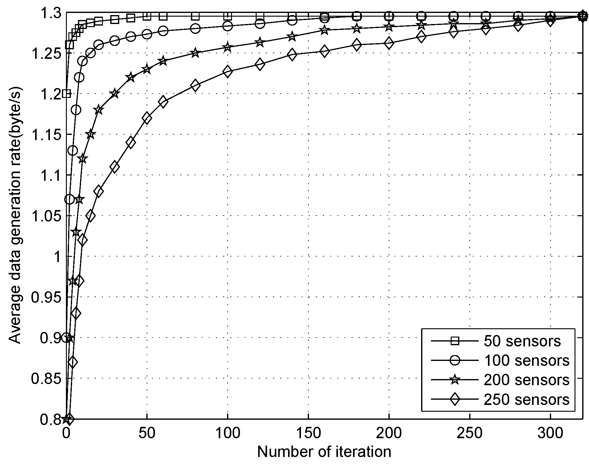 Figure 22 shows that the data generation rate for each sensor converges to maximum value in our algorithm when the number of sensors are , respectively. For fewer nodes, the algorithm converges faster to the maximum generation rate. As the number of nodes increase, convergence of iterations needs to increase gradually. This is because, with the expansion of a network scale, the total sample space is growing, and algorithms often need to go through more iterations to achieve convergence. As it can be seen from Figure 22 , when the number of nodes is and 250, the number of times to reach of maximum generation rate value needs: iterations to be performed, repectively. Overall, it will converge to maximum value with iterations no more than double the size scale of the networks in all scenarios, which is affordable in terms of the computing ability of the sensors.