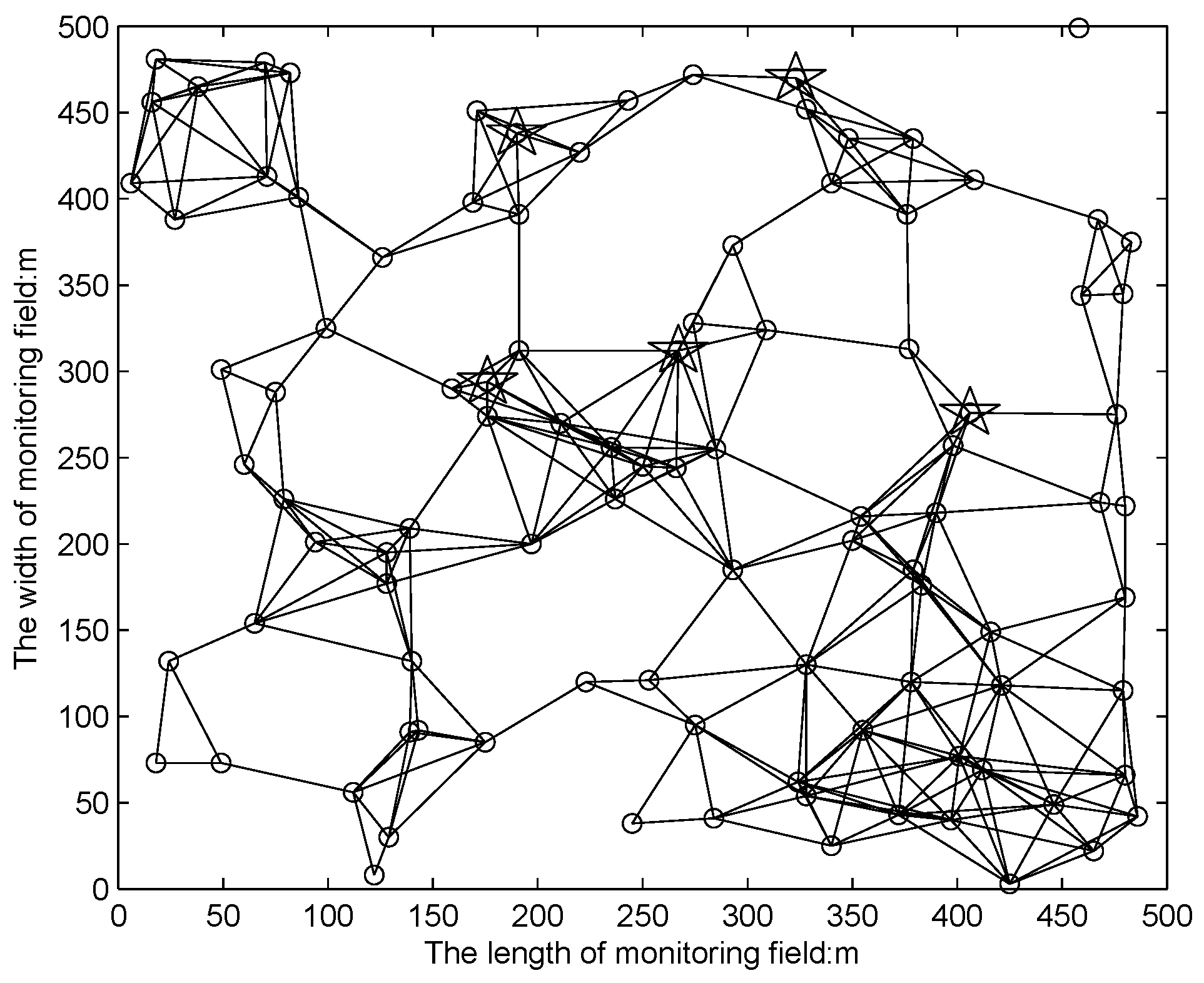 The connectivity graph is provided in Matlab for expressing the routing paths for all sensors with connection to any one sink, where 100 sensors and 5 sinks are deployed in a 500 m × 500 m square field, which is shown in Figure 23. By considering the limited energy supplement, a source node still chooses a closer base station as its destination. However, the packets from all sources may travel through all intermediate nodes in the network area before they reach a sink, and the communication energy consumption will be balanced to all nodes in order to improve sensor utilization efficiency.