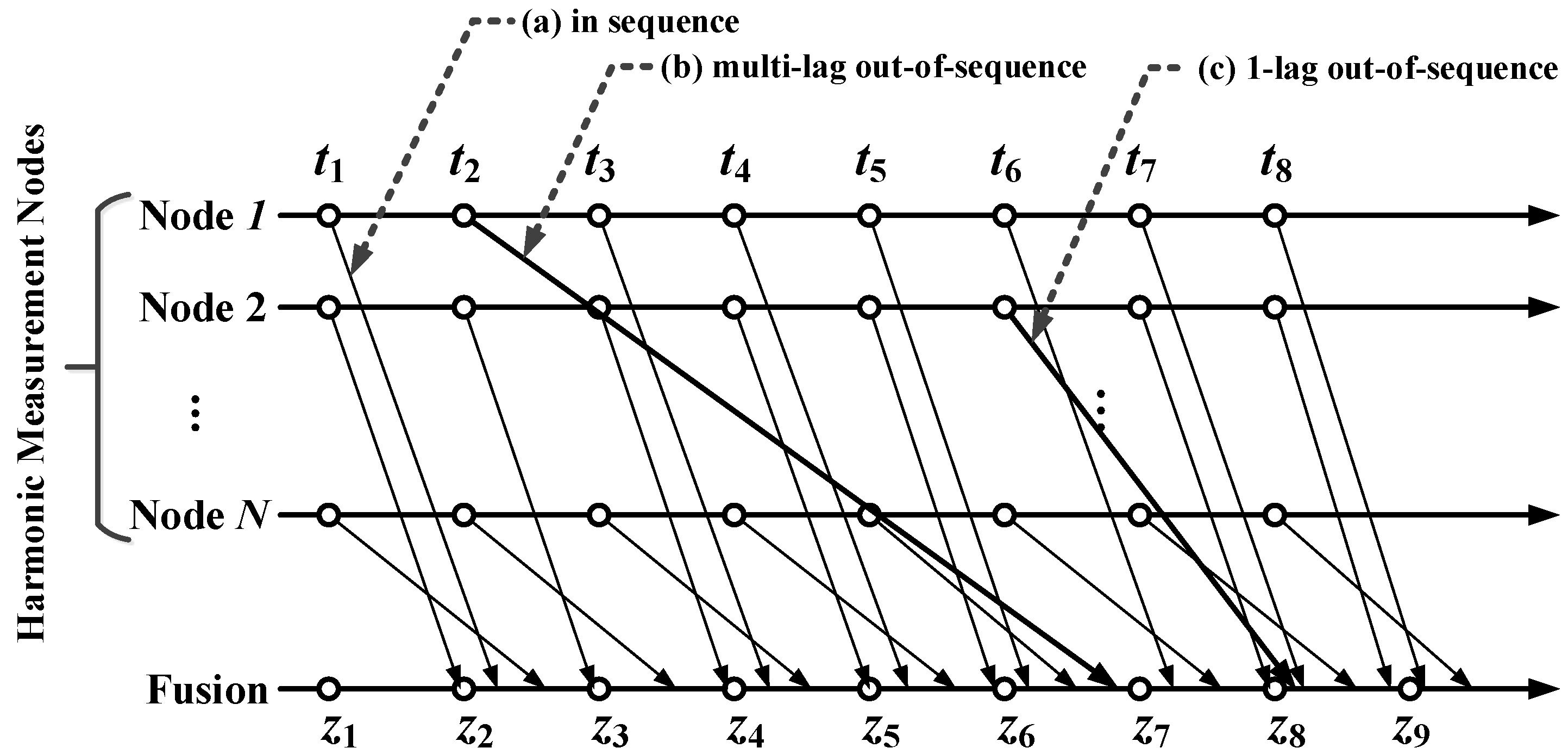 Traditional OOSM algorithms are based on the Kalman filter or the particle filter with statistic theory [7]. In the random-lag, multi-channel situation, a priori dynamic function is necessary, and statistics analysis is comprehensive and difficult to implement. For target tracking, the dynamics can be regulated as certain patterns, like uniform rectilinear motion or constant acceleration. However, in the residential and industrial power utilization network, the customer devices are becoming the main part of the harmonic sources. The harmonics injected into the grid depends on the user behavior, which is difficult to predict. The harmonics does not change in a definite pattern. Online identification of the non-stationary harmonic sources requires a real-time and precise measurement. Thus, the out-of-sequence problem is not ignorable in the problem, and an optimized estimation method is required.