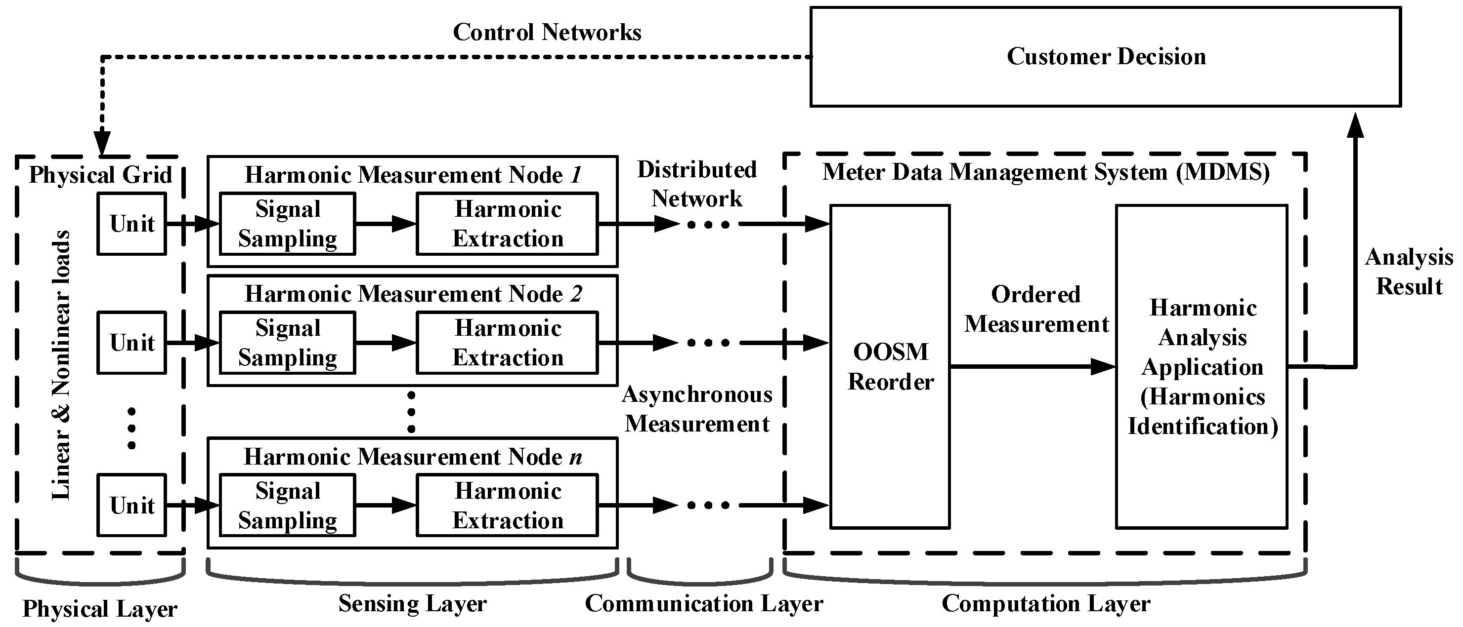 On the demand side, the automated meter reading (AMR) system, which behaves only as one-way manual centralized detection, is at the last gasp of its use corrections , while the advanced metering infrastructure (AMI) with a distributed architecture and integrated electrical information analysis service is gradually taking its place [5]. For the prospect of the electrical metering system, the smart grid is a promising solution for a less centralized and more consumer-interactive network. Within this measuring framework, electrical characteristics are collected through scattered smart meters, then meter data management systems dispose integrated computing and make deploying strategies accordingly to ensure high quality power. Harmonic measurement is an essential part of power quality assessment. Harmonics on the demand side mainly come from nonlinear appliances. Distorted harmonics introduce fluctuations, sags and disequilibrium into the grid, leading to potential damages and power failures. Fast and online harmonic analysis is significant in power grids and facing new challenges under distributed metering architectures.
