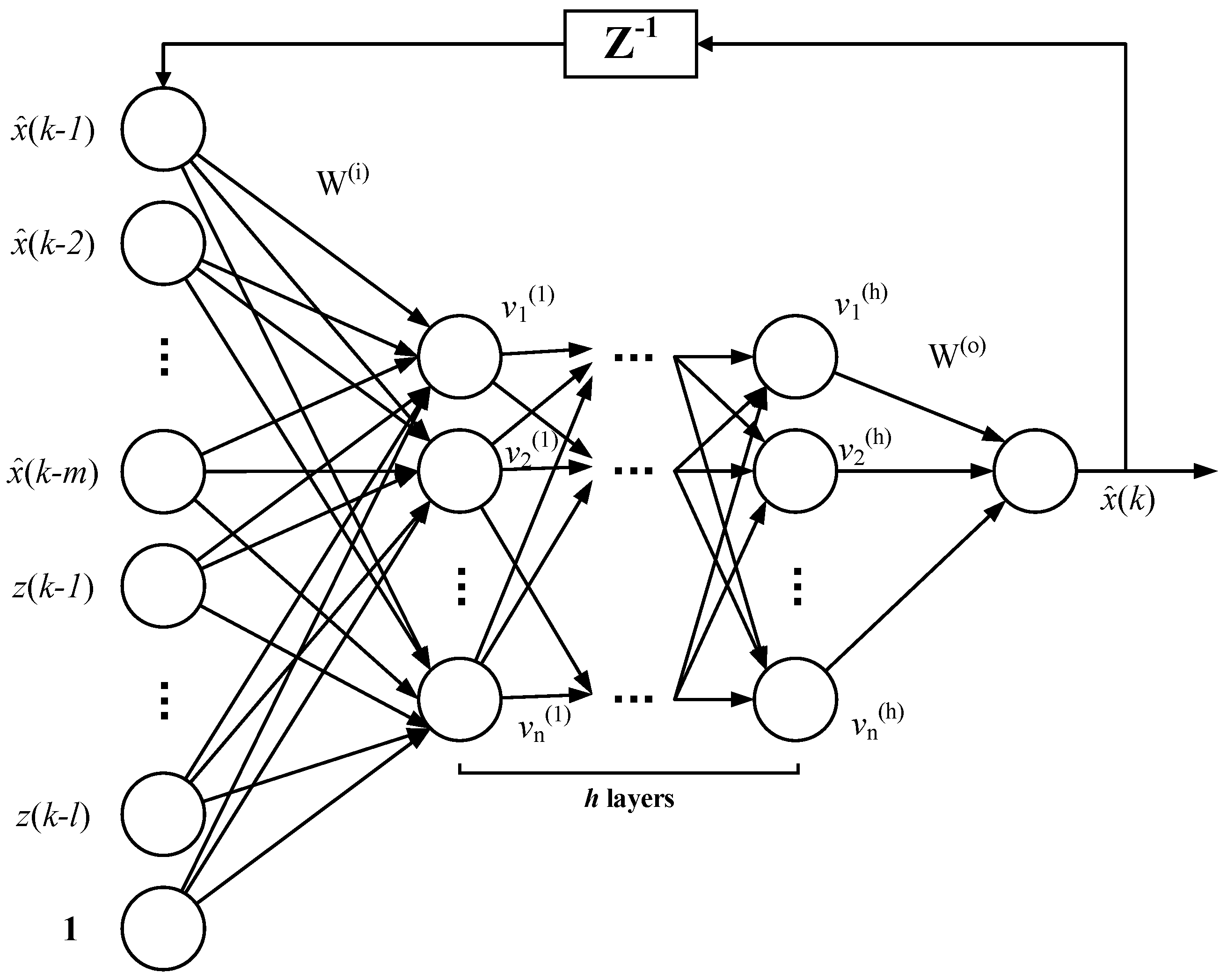 In this paper, the parallel NARX structure is adopted for prompt feedback, as shown in Figure 3. Each layer uses the sigmoid function as , for the sake of its low computational complexity on derivation. , which is useful in the following analysis.