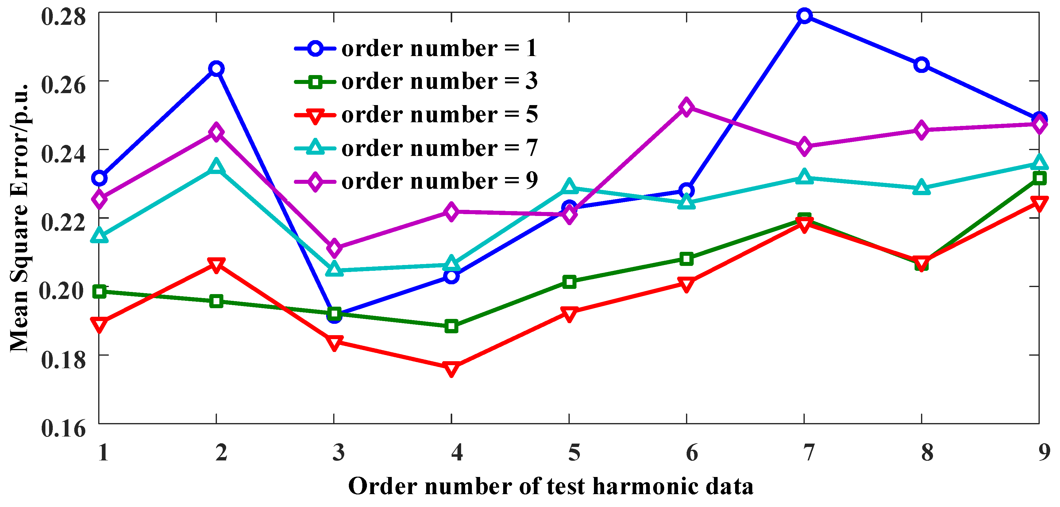 The 3rd–9th odd harmonics are used for harmonic measurement verification, which are capable of representing the harmonic measurement precision of the OOSM process. The results indicate that the NARX neural network can reduce the error introduced by the out-of-sequence measurement. It can also be figured that the OOSM algorithm alone does not convey a productive decrease on the out-of-sequence measurement error. The MSE of the measurements are reduced by more than .