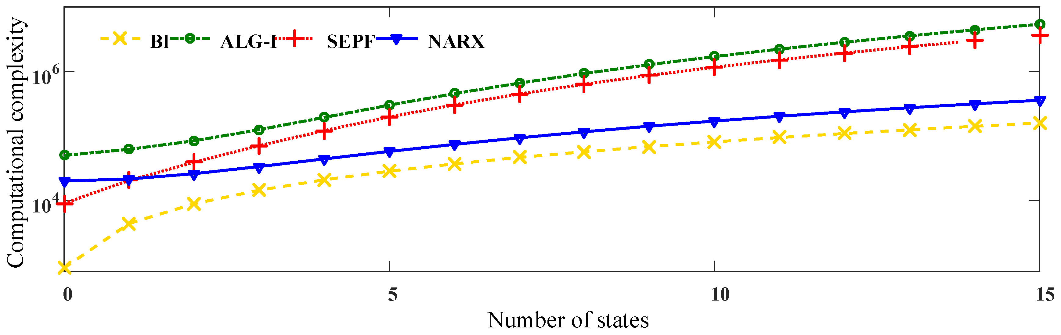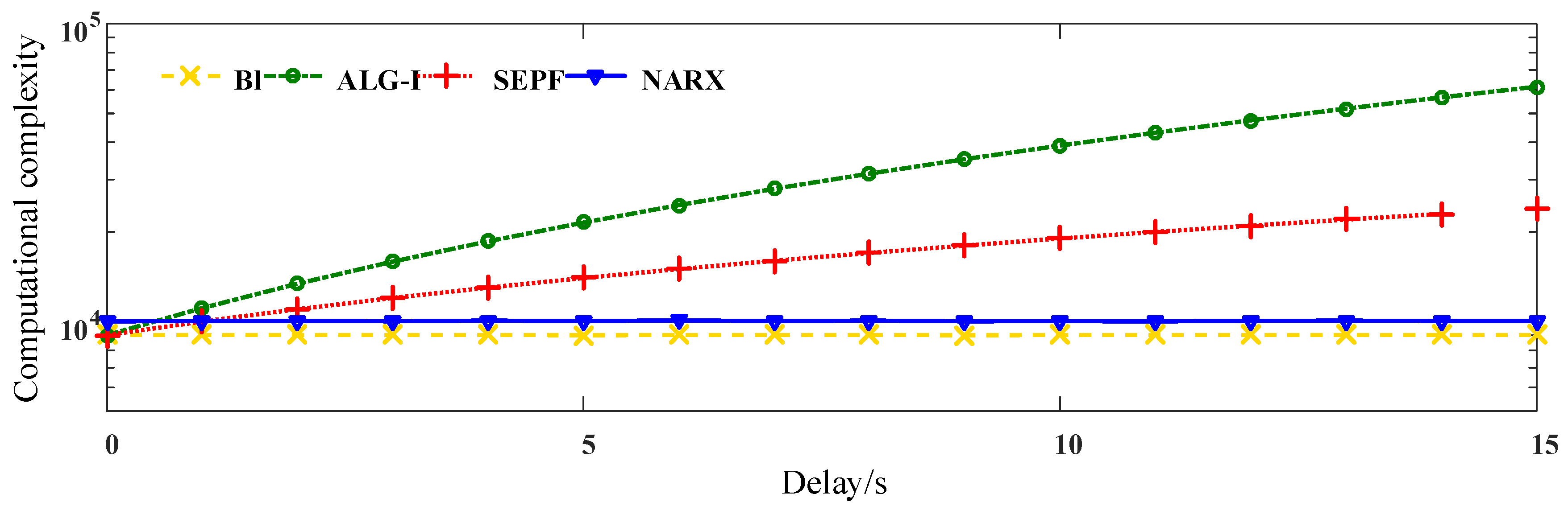 The retrodiction algorithm can be implemented in the centralized computing unit or distributed data fusion units as long as the out-of-sequence data occur. Other than the measurement accuracy, computational complexity and memory consumption are important indexes indicating the algorithm performance. This is important for online harmonic analysis applications. This section compares to the computational complexity and memory consumption of the NARX-based method with the Kalman filter- and the particle filter-based methods.