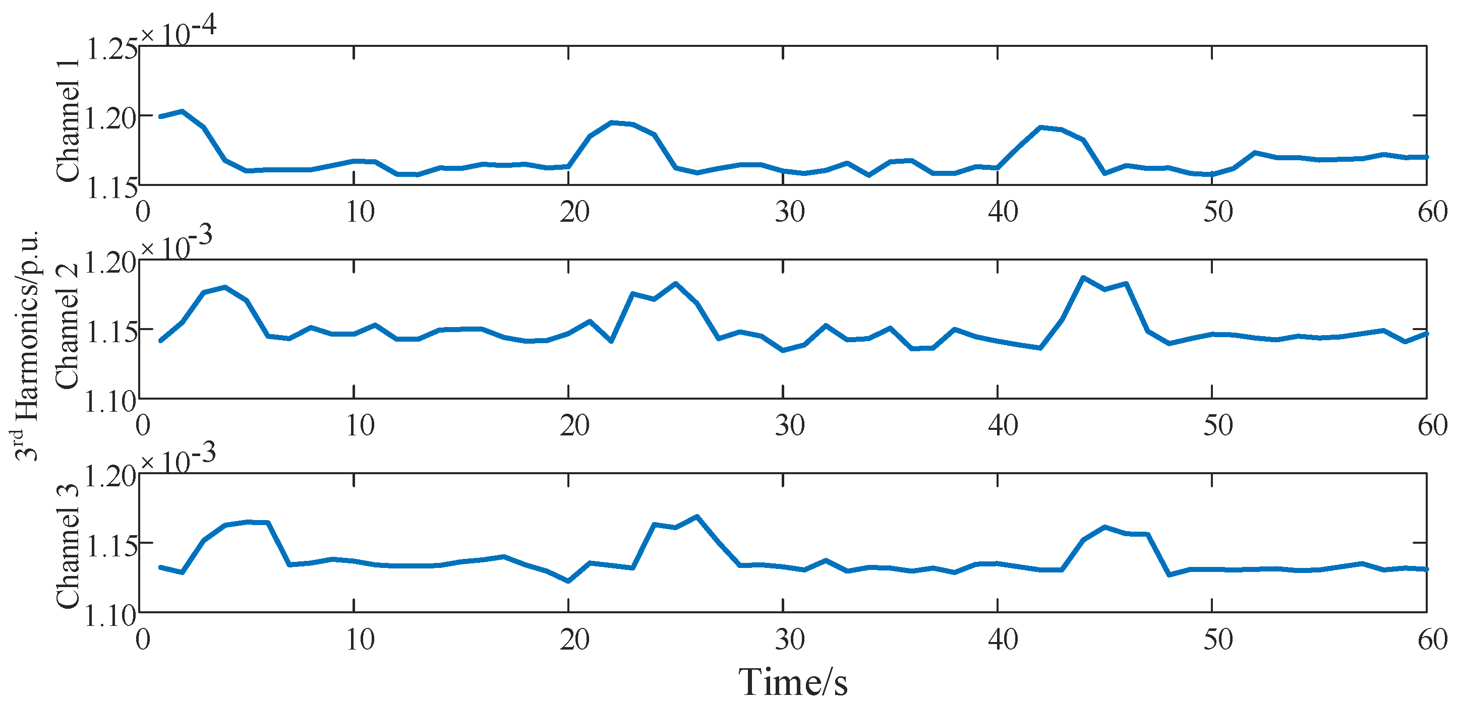 Third current harmonics of 3 typical channels at the same PCC with transient harmonic injection in Channel 1.