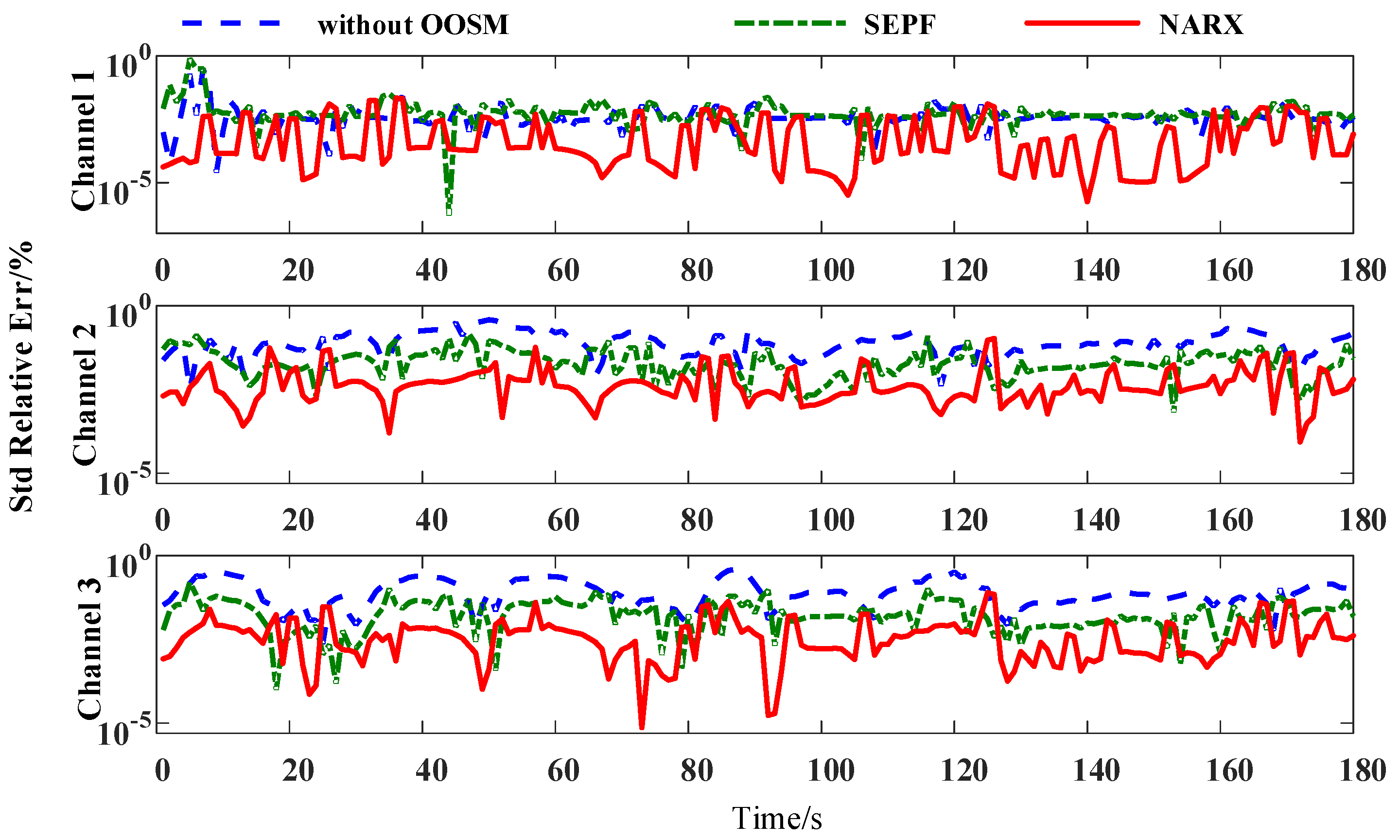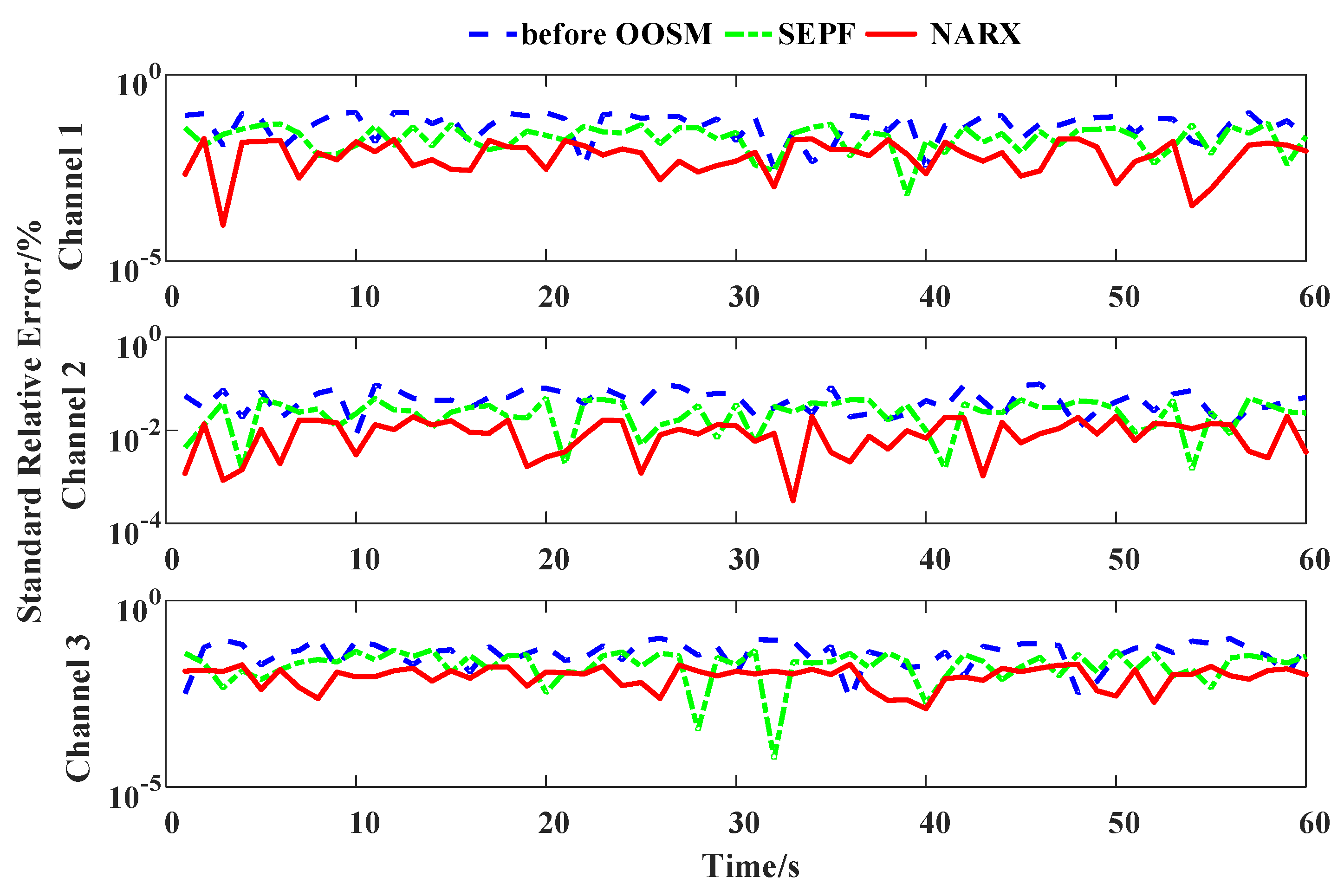 When the transient harmonic pulse does not occur in Channel 1, Figure 11 shows that the NARX-based OOSM method leads to a less standard relative error of harmonic measurement than SEPF, as has been discussed in Case I. When the transient harmonic pulse occurs with the 2-lag disorder, the estimation error is remarkable without retrodiction. SEPF and NARX-based OOSM methods both reduce the estimation error, and the NARX-based method offers a better performance. Yet, the estimation error at the transient harmonic event is still larger than other time points. It also shows that the OOSM method performs a larger reduction with frequently changing harmonic waves in Channels 2 and 3. The harmonics in Channel 1 change thoroughly, but smoothly; the OOSM makes a minor fluctuation. This indicates that OOSM modifies greatly instantaneous and fierce harmonic fluctuations, such as voltage sags and instant impacts.