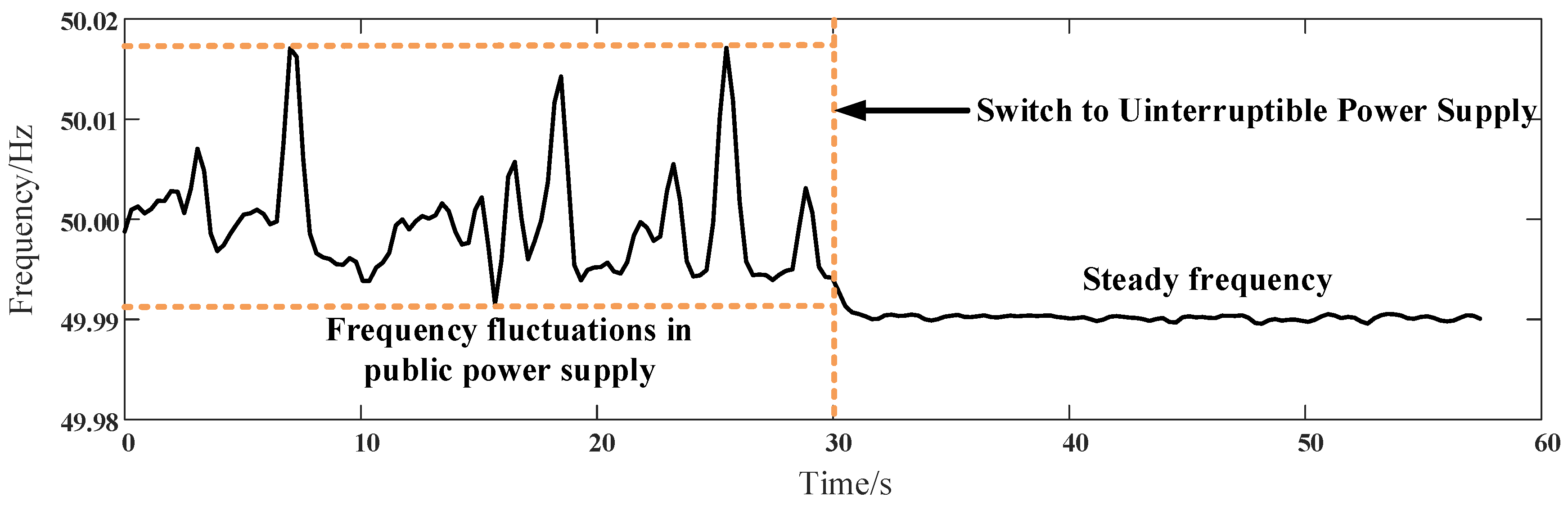 Base frequency changes during the measuring process. During 0–30 s, the network is connected to the public power; during 30–60 s, it is connected to the uninterruptible power supply.