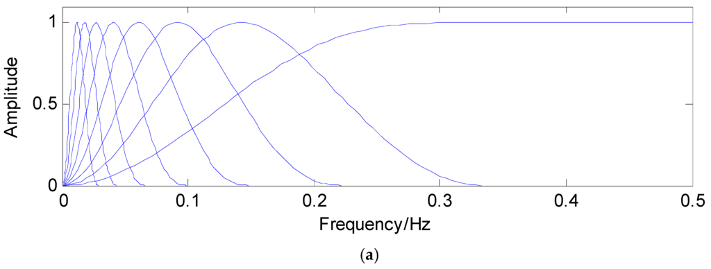 Using different parameters, the TQWT can decompose the concerned signals into transient impact parts and high oscillatory parts. The main parameters in the TQWT are the Q-factor Q, the redundancy r and the stages (levels) L. According to the definition of Q-factor, it can be concluded that Q is a measure of the number of oscillations the wavelet exhibits. To our knowledge, the sustained oscillatory signals have narrow bandwidth and are corresponding to high Q-factor. On the contrary, the transient impact signals have low Q-factor. Frequency responses with different Q are shown in Figure 2. The parameter r denotes the redundancy of the TQWT through certain stages. The parameter J represents the number of filter banks. Figure 3 is an example of L = 3. When L is determined, L + 1 subbands can be obtained: the high-pass filter output of each filter bank and the low-pass filter output of the final filter bank [28,29,30,31,32,33].