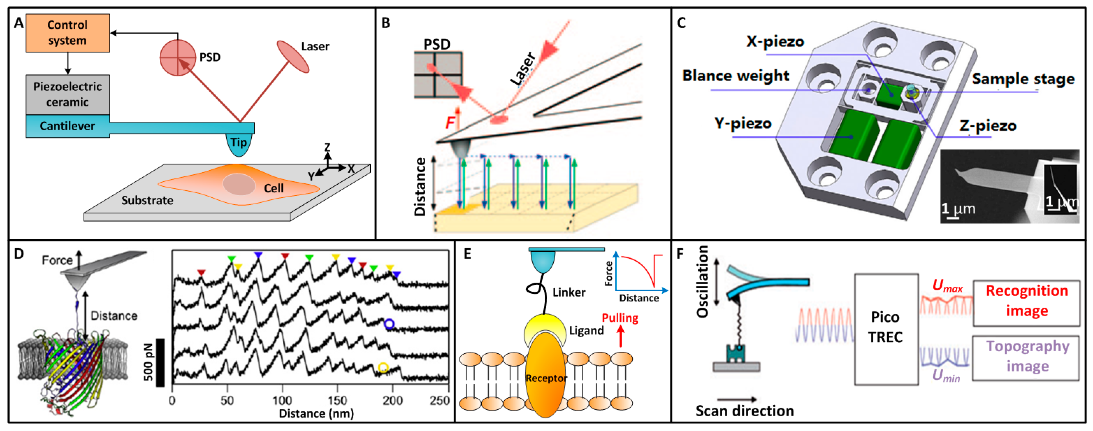 Typical AFM single-molecule techniques. (A) Principle of AFM. The tip raster scans the sample surface, during which the cantilever move vertically to maintain a constant interaction force between tip and sample. The force is detected by a laser reflected off the backside of the cantilever. (B) PFT multiparametric AFM imaging. The AFM tip approaches the withdraws from the sample in a pixel-for-pixel manner to record forces, F, over the tip-sample distance in force curves. The high precision of the approach allows detection of pixel sizes <1 nm2 with a positional accuracy of ~0.2 nm and forces at piconewton sensitivity. Reprinted with permission from [18]. Copyright 2013 Macmillan Publishers Limited. (C) Structure of a high-speed AFM scanner for narrow area (1 μm × 4 μm) imaging and scanning electron micrograph of a small cantilever for high-speed AFM. Reprinted with permission from [37]. Copyright 2014 Elsevier Ltd. (D) Mechanical unfolding of the membrane protein FhuA embedded in a lipid bilayer. A single FhuA is nonspecifically attached to the AFM tip. Increasing the distance of tip and membrane establishes a mechanical force that induces unfolding of FhuA. Force extension curves recording during unfolding a single FhuA show force peaks that measure the interactions established by unfolding intermediates of FhuA. Reprinted with permission from [49]. Copyright 2012 Elsevier Ltd. (E) Probing single receptors on cell surface with functionalized tip. A ligand is attached to the AFM tip and controlled to touch the receptor on the membrane. The receptor-ligand interaction is detected by pulling the receptor, during which force curve is recorded. The abrupt peak in the force curve corresponds to the receptor-ligand unbinding event. (F) TREC imaging. Special electronic circuit in the TREC box separates the maxima and minima of the oscillation amplitude during binding and generates the recognition and topographic image from them respectively. Reprinted with permission from [51]. Copyright 2016 American Chemical Society.