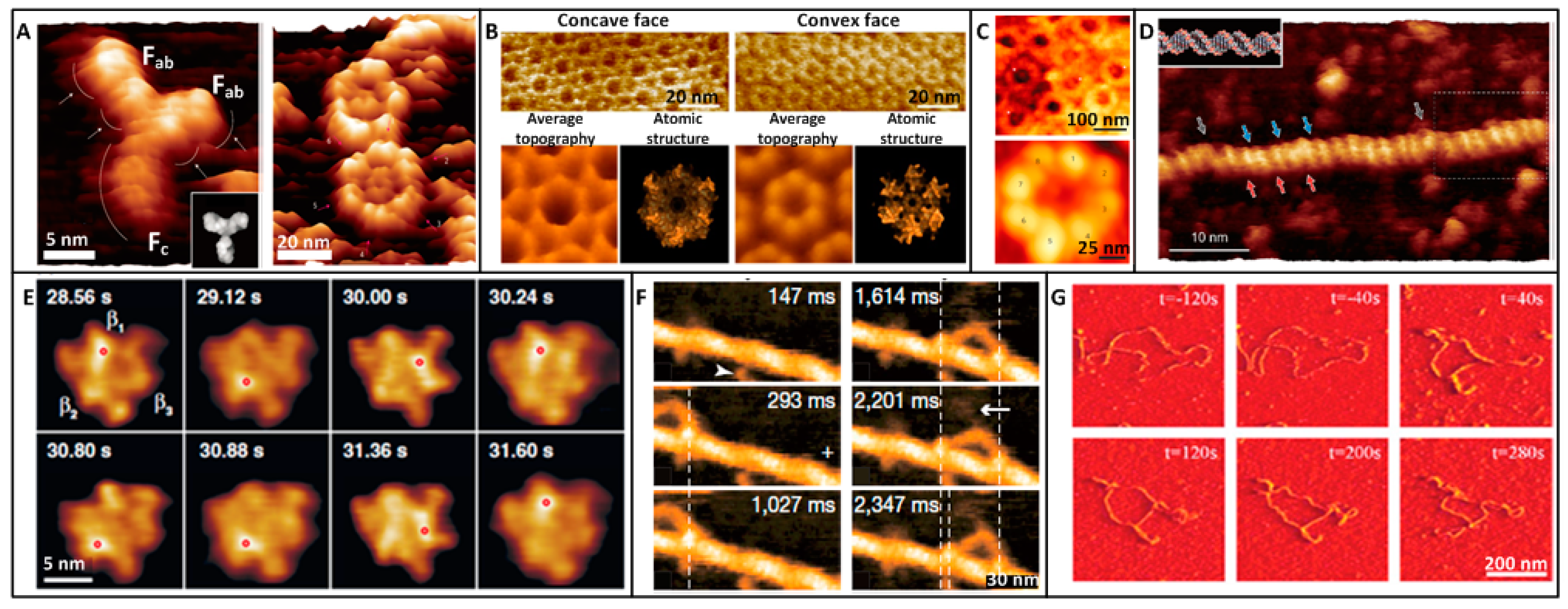 Imaging the static and dynamic structures of individual biological molecules under physiological conditions by AFM. (A–D) Static imaging. (A) IgG antibody molecule. High-resolution AFM image of anti-HSA mouse monoclonal antibody (IgG) adsorbed on a mica and self-assembled antibody hexamers composed of six IgG molecules. Images were recorded in 50 mM ZnCl2 and 50 mM MgCl2 solution respectively. Reprinted with permission from [58]. Copyright 2014 Macmillan Publishers Limited. (B) Bacterial microcompartment protein. The concave face has a depression diameter of 52.8 angstrom whereas the convex face has a diameter of 47.1 angstrom measured by AFM cross-section analysis. Reprinted with permission from [59]. Copyright 2015 American Chemical Society. (C) Nuclear pore complexes (NPCs). Numerous NPCs in the cytoplasm-facing outer nuclear membrane. Average projected structure of a vacant NPC showing eight cytoplasmic filaments that surround a central pore. Reprinted with permission from [60]. Copyright 2016 Macmillan Publishers Limited. (D) DNA. The red and blue arrows indicate the positions of major and minor grooves of B-DNA, respectively. Gray arrows indicate the local melting regions of the plasmid DNA. Reprinted with permission from [61]. Copyright 2013 American Chemical Society. (E–G) Dynamic imaging. (E) Rotary motor molecule. Successive AFM images showing the conformational change of β subunits in ATP. The highest pixel in each image is indicated by the red circle. Frame rate, 12.5 frame/s. Reprinted with permission from [39]. Copyright 2011 AAAS. (F) Walking myosin molecule. Successive AFM images showing the processive movement M5-HMM in ATP. Arrows indicate coiled-coil tail of M5-HMM tilted towards the minus end of actin. Reprinted with permission from [12]. Copyright 2010 Macmillan Publishers Limited. (G) DNA after drug stimulation. AFM images of the conformational changes of single DNA induced by the injection of Dau. Reprinted with permission from [63]. Copyright 2013 American Chemical Society.