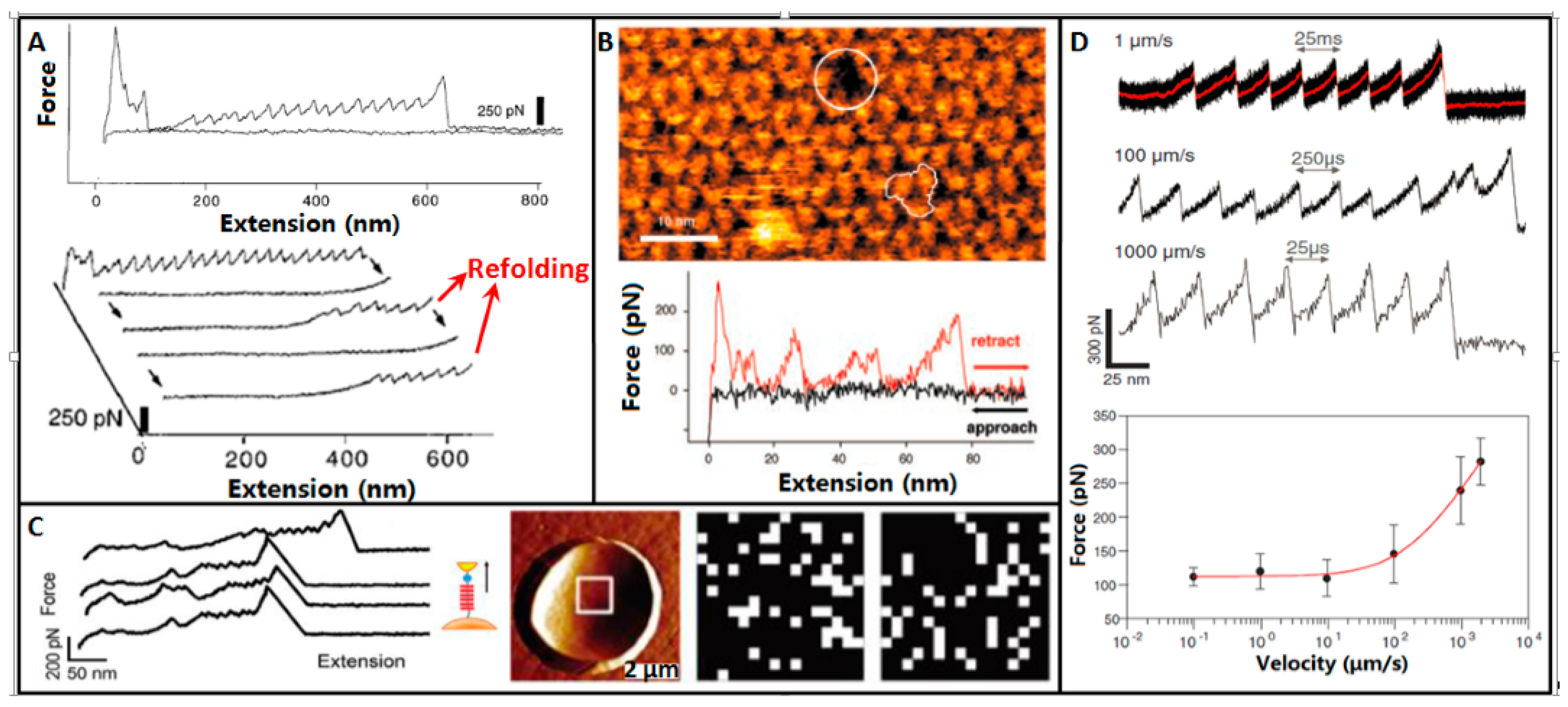 Unfolding single proteins by AFM. (A) Titin molecule. Force extension curves obtained by stretching titin proteins show periodic features that are consistent with their modular construction. Repeated stretch-relaxation cycles of single titin fragments demonstrate refolding. Reprinted with permission from [66]. Copyright 1997 AAAS. (B) Bacteriorhodopsin membrane protein. The tip and protein surface was separated at a velocity of 40 nm/s while the force spectrum was recorded. After the force extension curve was recorded, a topography of the same surface was taken to show structural changes. Note that a single monomer is missing (white circle). Reprinted with permission from [25]. Copyright 2000 AAAS. (C) Membrane protein on live cells. Force extension curves recorded between an Ig-T tip and surface of yeast cells expressing Als5p. Cells are trapped in porous membrane. Unfolding forces on cell surfaces were mapped by recording arrays of force extension curves on 500 nm × 500 nm areas. Reprinted with permission from [69]. Copyright 2009 American Chemical Society. (D) High-speed unfolding of titin molecule. Typical force extension curves are recorded at different retraction velocities (1, 100, 1000 µm/s) and dynamic force spectrum of the intermediate unfolding state. Solid red line is the theoretical fitting. Reprinted with permission from [71]. Copyright 2013 AAAS.