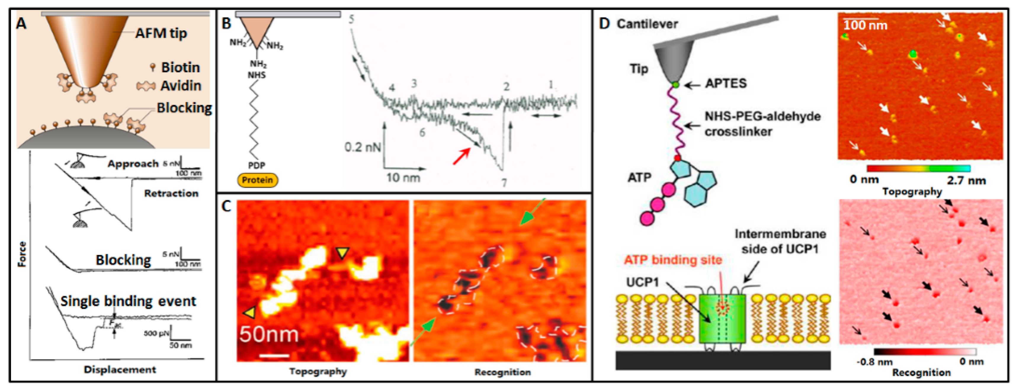 By scanning the substrate coated by biological molecules with functionalized tip at TREC mode, the specific recognition information of the biological molecules can be rapidly acquired. In 2014, Stroh et al. [77] investigated the nucleosomes on mica by TREC imaging, as shown in Figure 4C. Mica was treated by glutaraldehyde and 3-aminopropyltriethoxysilane. The nucleosomal arrays adsorbed onto the surface of the treated mica. Polyclonal anti-histone H3 antibodies were thiolated and linked to the surface of AFM tip via PEG linker. Images were acquired in PBS. The topography image and recognition image was simultaneously recorded. The dark pixels in the recognition image corresponded to the specific recognition information. The recognition patches and the pattern in which they occurred clearly coincided with the positions of the nucleosomes in the topography image, demonstrating the validity of TREC imaging in recognizing specific molecules. TREC imaging can not only recognize the molecules on mica, but also can recognize the molecules in lipid bilayers. In 2013, Zhu et al. [78] investigated the proteins in lipid bilayer by TREC imaging, as shown in Figure 4D. The uncoupling protein 1 (UCP1) was reconstituted in bilayers on mica. ATPs were linked to AFM tip via NHS-PEG-aldehyde spacer molecule. Images were acquired in buffer solution. The recognition information (dark pixels) in the recognition image was fully consistent with the positions of proteins in the topography image. Compared with directly adsorbing proteins onto mica surface, reconstituting proteins in lipid bilayer can better mimic the proteins in cytomembrane and thus is useful in investigating the behaviors of single proteins.