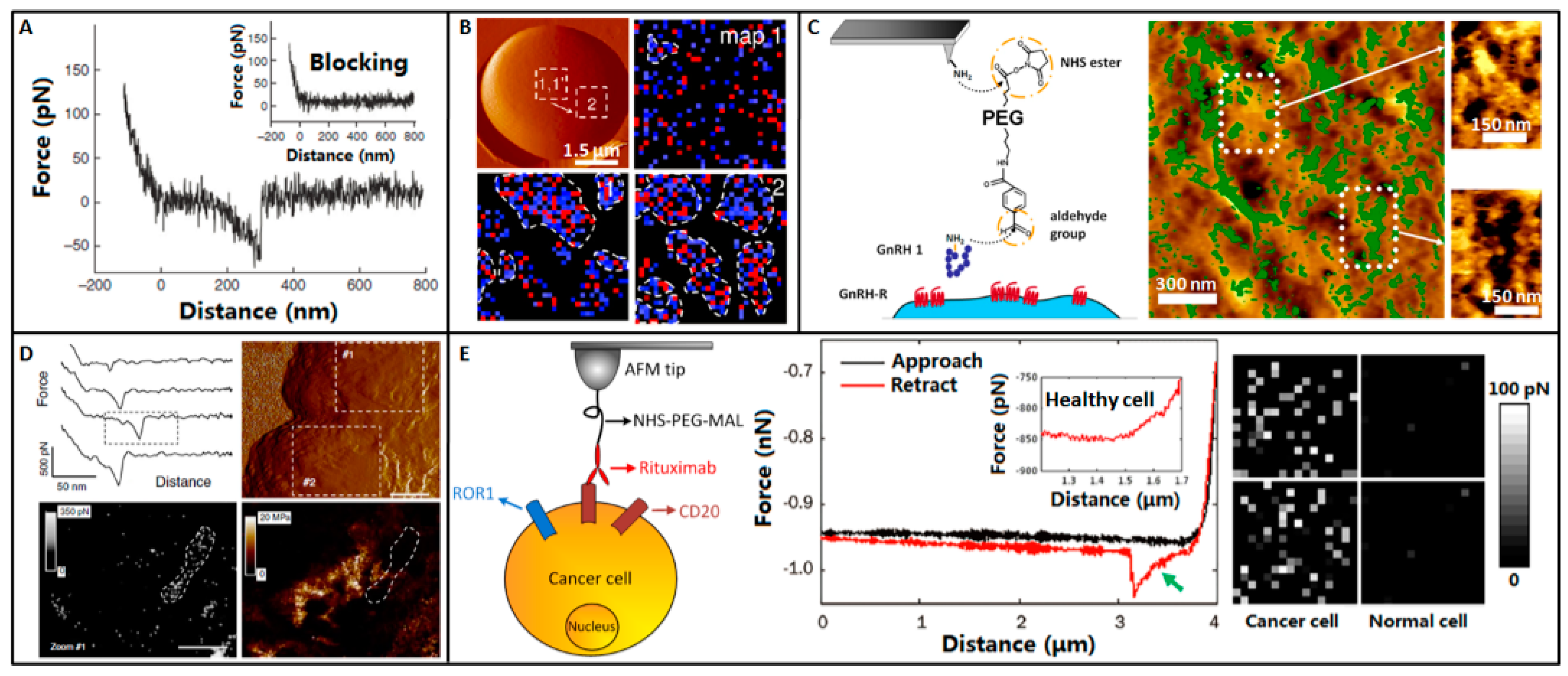 Detecting individual receptors on cell surface. (A) Recognition of SGLT1 on the surface of intact cells by AFM tip coated with specific antibodies. Typical force curve shows specific interaction between the antibody and SGLT1 upon tip-surface retraction. The specific interaction is blocked by adding free antibodies to the solution (inset). Reprinted with permission from [89]. Copyright 2011 Macmillan Publishers Limited. (B) Formation and propagation of Als5p nanodomains. Blue andred pixels correspond to forces smaller and larger than 150 pN, respectively, and thus to Als5p recognition and unfolding. Reprinted with permission from [90]. Copyright 2010 National Academy of Sciences. (C) Location of the GnRH-Rs on the T24 cell surface by TREC imaging. Overlays of recognition maps of GnRH-Rs onto the corresponding topography images. Reprinted with permission from [91]. Copyright 2014 American Chemical Society. (D) Bacteriophage extrusion localizes into soft nanodomains detected by PFT imaging. The force curves recorded during PFT imaging indicate that the phage-cell wall complex behaves as a Hookean spring. Topography image, adhesion image and elasticity image is recorded simultaneously. Reprinted with permission from [92]. Copyright 2014 Macmillan Publishers Limited. (E) Molecular recognition on primary tumor cell from clinical lymphoma patients. Tumor cells from bone marrow sample are recognized by ROR1 fluorescence labeling. CD20-rituximab interactions are detected on tumor cell. There is a specific unbinding peak (green arrow) in the force curve recorded on tumor cell but not in the force curve recorded on healthy cell. The distributions of CD20s on tumor cells are mapped by obtaining arrays of force curves on 500 × 500 nm2 areas. Reprinted with permission from [93]. Copyright 2013 Elsevier Inc.