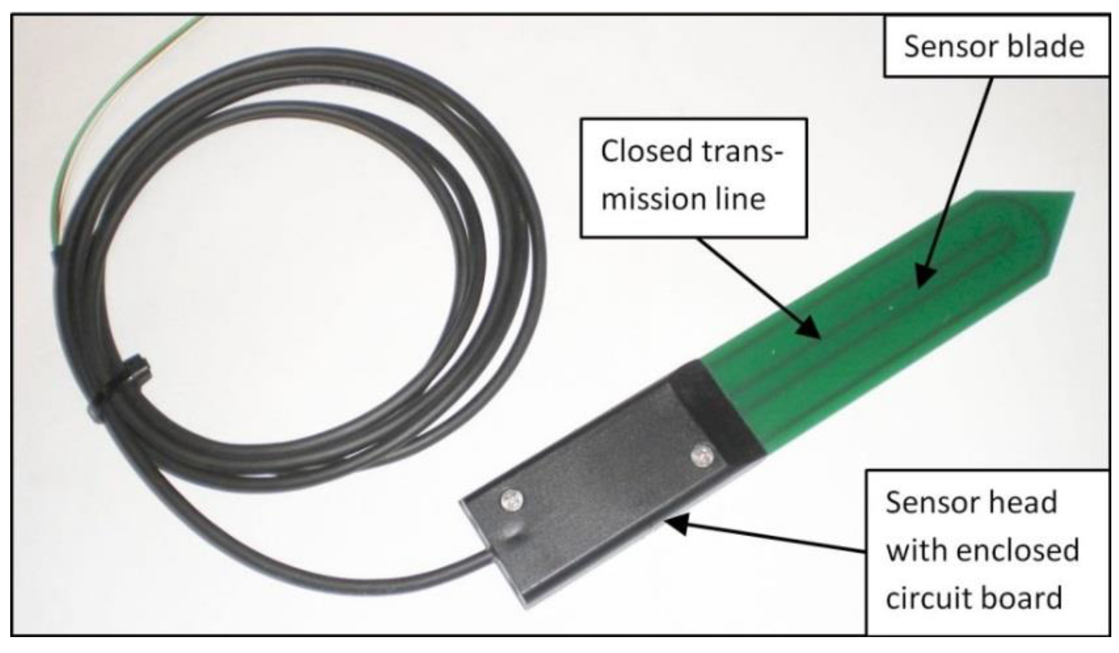 Besides destructive gravimetric sampling, electromagnetic (EM) methods, such as time domain reflectometry (TDR) (e.g., [12]), time domain transmission (TDT) (e.g., [13]), and capacitance [14] and impedance sensors (e.g., [15,16]), are most commonly used for soil water content measurements at the point scale. All EM techniques rely on the dependency of the soil dielectric permittivity on the SWC. As the dielectric permittivity of liquid water is much higher than the dielectric permittivity of other soil components, SWC is the principal factor governing EM wave propagation in the soil. TDR and TDT sensors measure the propagation velocity of EM waves along open and closed transmission lines [13], respectively, whereas capacitance sensors typically determine SWC by measuring the charge time of a capacitor (i.e., the soil-probe system) for a given voltage [17]. Typically, capacitance sensors operate at a measurement frequency between 50 and 150 MHz, while TDR and TDT operate at higher frequencies. Higher frequencies are favorable because SWC measurements are expected to be less influenced by the electrical conductivity and the imaginary dielectric permittivity of the soil [18]. Nevertheless, the need for automated SWC measurement systems have largely increased the number of low-cost SWC sensors, e.g., for irrigation purposes [19].