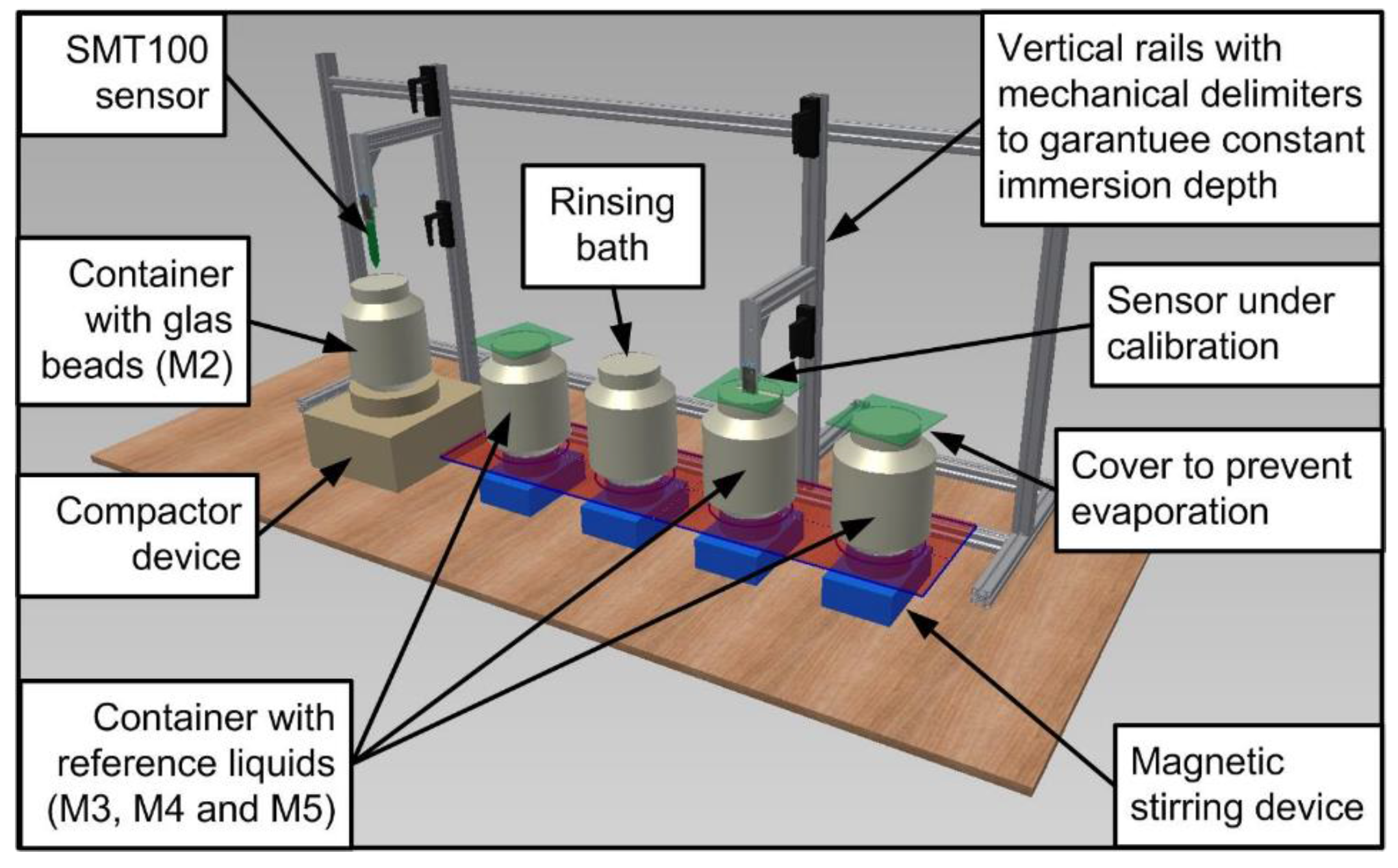 The other containers are filled with mixtures of 2-isopropoxyethanol (i-C3E1) and deionized water (M3–M5). These containers are placed on magnetic stirring devices to avoid demixing of the reference liquids. In addition, they are covered with a lid to prevent evaporation. The reference liquids are tested from time to time using reference SWC sensors to check whether the reference permittivity value has not changed due to evaporation or contamination. One additional container is used to clean the sensors after each measurement (denoted as rinsing bath). A framework behind the containers holds two vertical rails on which the SMT100 sensors can be fixed and moved upwards and downwards (Figure 2). Mechanical delimiters on the vertical rails guarantee a predefined immersion depth of the SMT100 sensors. The calibration station is designed in such a way that two persons can work in parallel.