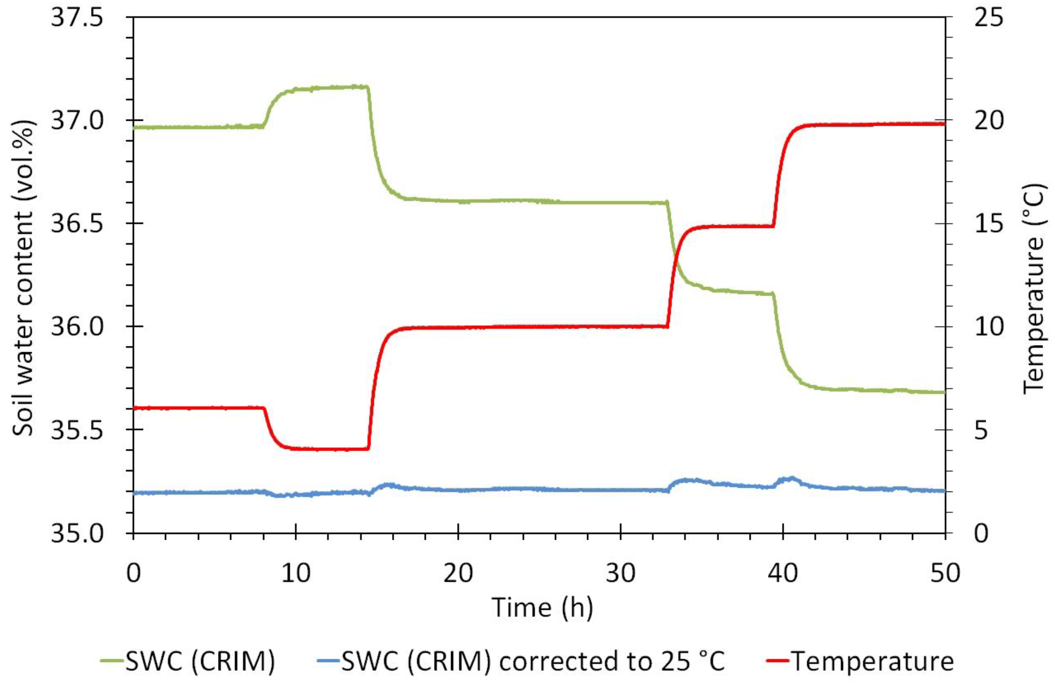 The average temperature and soil water content response of three SMT100 sensors is presented in Figure 4. Clearly, temperature has a significant influence on the sensor output of the SMT100 sensor. However, after correcting the sensor response using the temperature dependence of the dielectric permittivity of water from [40], the temperature sensitivity disappeared to a large extent. Only some minor fluctuations are present in transient periods the range within the corrected permittivity estimate varies (~0.1 vol.%) due to a time delay between the equilibration of the temperature sensor and the entire sensor electronics. This indicates that change in permittivity with changing temperature is solely related to the temperature sensitivity of the dielectric permittivity of water and that the sensor electronics are showing no temperature effect. Since the SMT100 sensor measures temperature, users can easily apply our correction approach.