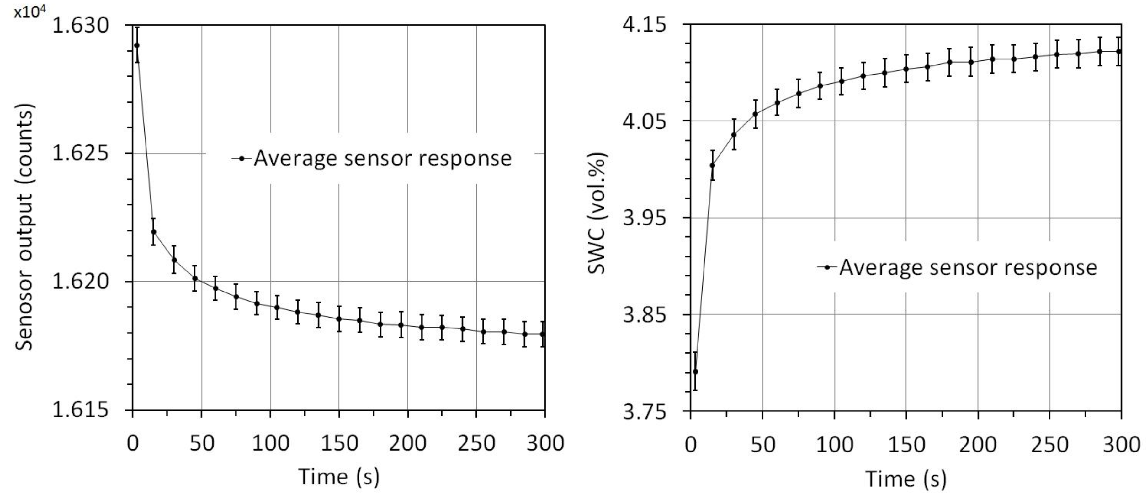 Figure 5 shows the decrease in sensor response due to the increasing density of the glass beads packing during the compaction experiment. Clearly, the strongest changes in sensor response occurred in the first 15 s. Subsequently, the change in sensor response continuously decreased until the end of the experiment (after 300 s). The total difference in terms of raw counts was 113, which corresponds to an increase of equivalent SWC of 0.33 vol.% (Figure 5). Based on these results, it was decided to perform the calibration measurement after 120 s as a compromise between calibration efficiency and accuracy. The change in sensor response due to further compaction from 120 to 180 s was negligible with approx. 0.05 vol.%.