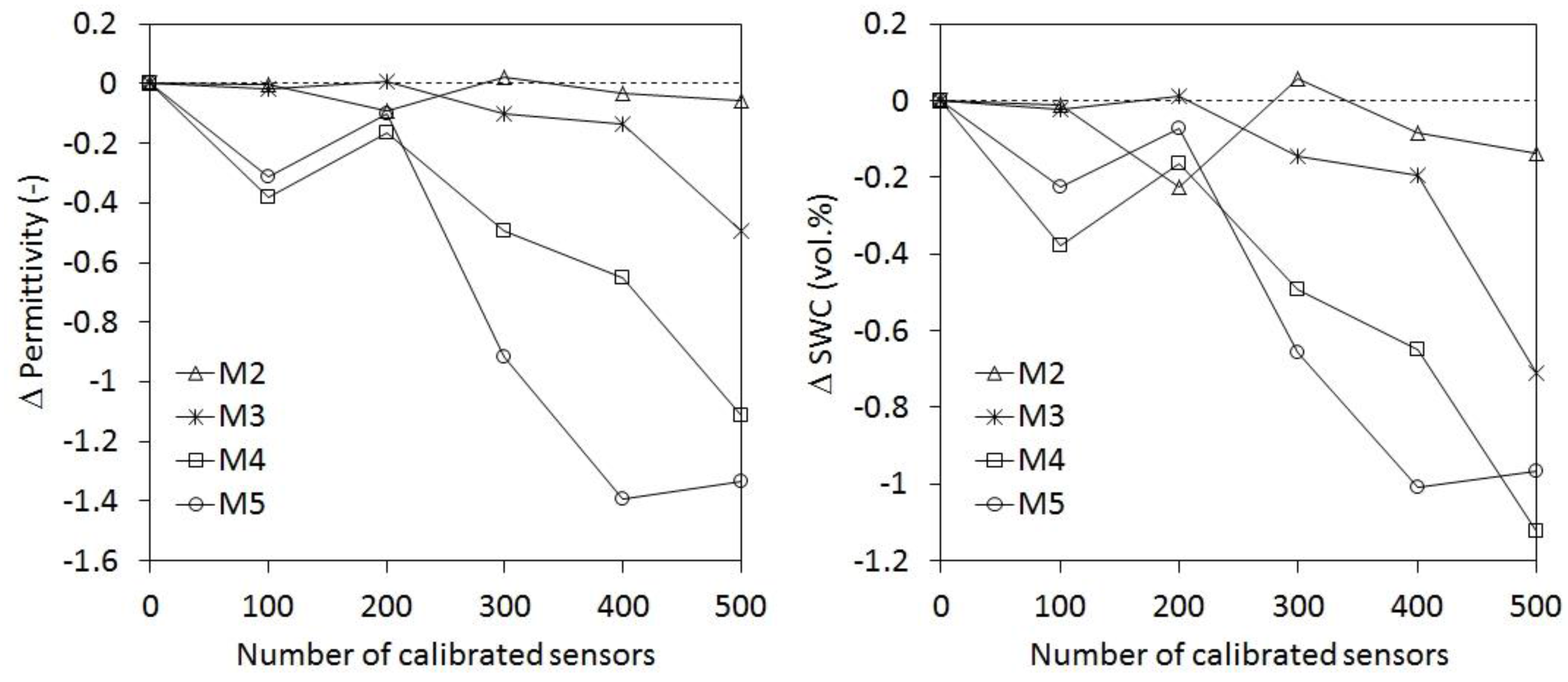 For wireless network application in which a very large number of SWC sensor would need to be calibrated, it is of interest to determine the decrease in accuracy when sensor-to-sensor variability is ignored. Therefore, Figure 7 also presents a single “universal” calibration curve which was derived from the complete set of calibration measurements. The RMSE (root mean square error) between reference permittivity and apparent permittivity estimated using the calibration model (Equation (1)) can be used as a measure of accuracy in this study (Table 4). It should be noted that the RMSE reported here does not include errors in the reference permittivity.