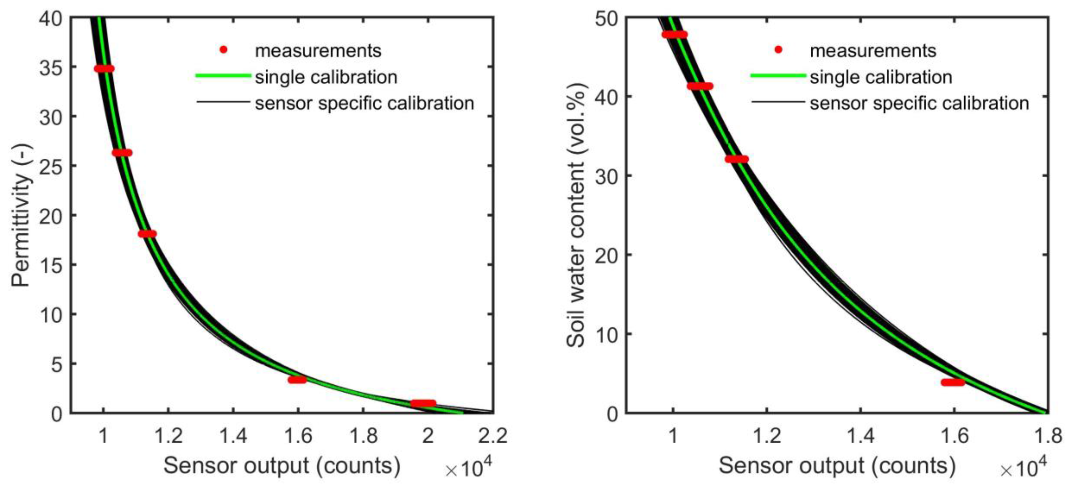 Alternatively, a two-step calibration procedure (e.g., [32,33]) can be used. In a first step, the relationship between sensor response and permittivity is determined for each sensor (i.e., a sensor-specific calibration). In a second step, site-specific relationships between permittivity and SWC can be established with a limited number of measurements on soil samples, preferably using the highly accurate TDR method (soil specific calibration). For the sensor-specific calibration, media with well-known dielectric properties (here referred to as reference permittivity), such as air, 2-isopropoxyethanol [34] and 1,4-dioxane [35] are used to relate the sensor response to dielectric permittivity. The advantages of using this approach are: (i) the avoidance of air gaps and density variations; (ii) the possibility to separate sensor- and soil-specific effects; and (iii) the ability to quickly calibrate multiple sensors for a wide range of dielectric permittivity (from 2 to 35). In the second step, the dielectric permittivity is related to soil water content using empirical or semi-empirical models (e.g., [36,37]). For more accurate SWC measurements, a site-specific calibration accounting for soil textural variation can also be performed on a limited number of samples (e.g., [30,31]).