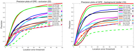 In order to investigate the effectiveness of the proposed tracker, we compare our tracker and the others in terms of the attributes listed in the last subsection. The results are shown in Figure 8 and Figure 9. On the videos with occlusion, our tracker ranks first among the evaluated trackers. In precision plots, CDT achieves 0.709, outperforming KCF by 1.3%. In success plots, CDT is 0.579, which is higher than KCF. Occlusion may pollute the target model and make it hard to extract features. KCF uses the HOG feature to describe the target which is stable when occlusion occurs. Though the proposed CDT exploits color distribution as a feature, we have a re-search method and an update strategy to overcome occlusion.