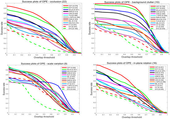 The success plots of sequences with occlusion, background clutter, scale variation and rotation. The performance score of each tracker is shown in the figure. Best viewed in color display.
